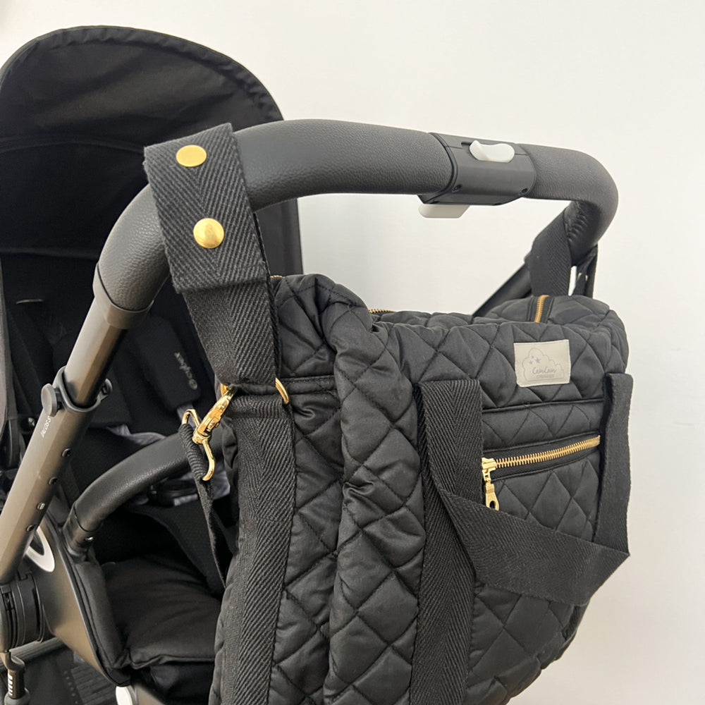 Discover the charm and functionality of the Cam Cam Copenhagen Black Changing Bag, designed to make outings with your little one stylish and organized. This diaper bag features a chic quilted design with a robust water-repellent coating, ensuring protection and durability for long-term use. Thoughtfully crafted, it includes heavy straps and an adjustable shoulder strap, coupled with small handle straps allowing it to easily attach to a pram or stroller. Enjoy the convenience of brass YKK zippers and ample storage including practical elastic pockets inside, external and internal zipped pockets, and a dedicated bottle pocket. From baby essentials to everyday needs, this versatile bag offers ease of use, optimal comfort, and seamless organization, making it an indispensable companion for every parent. Its elegant aesthetics combined with entertainment and stimulation features ensure this bag not only meets all safety and certification standards but also surpasses them. Enjoy a blend of style, functionality, and peace of mind with this exceptional accessory. Materials: Outer fabric: 100% Organic Cotton. Filling: 100% Oeko-tex Standard Polyester - OCS Made with 36% Organically Grown Material