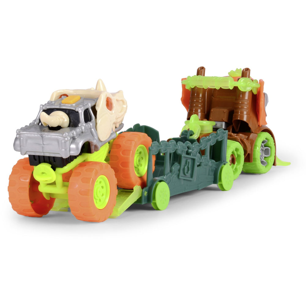 Explore a world of prehistoric adventure with the Dickie Toys Monster Ranger Dino! This captivating toy set, suitable for children aged 3 and up, features a 32 cm monster truck styled with a mammoth head-shaped hut that intriguingly folds up. Ignite your child's imagination with the dynamic combination of yawns, sounds, and lights each time the dinosaur truck roams. Not only does it foster educational value through imaginative play, but it's also designed with safety and ease of use in mind. The addition of a trailer enhances portability and storage, making this an ideal pick for endless interactive and engaging play sessions.