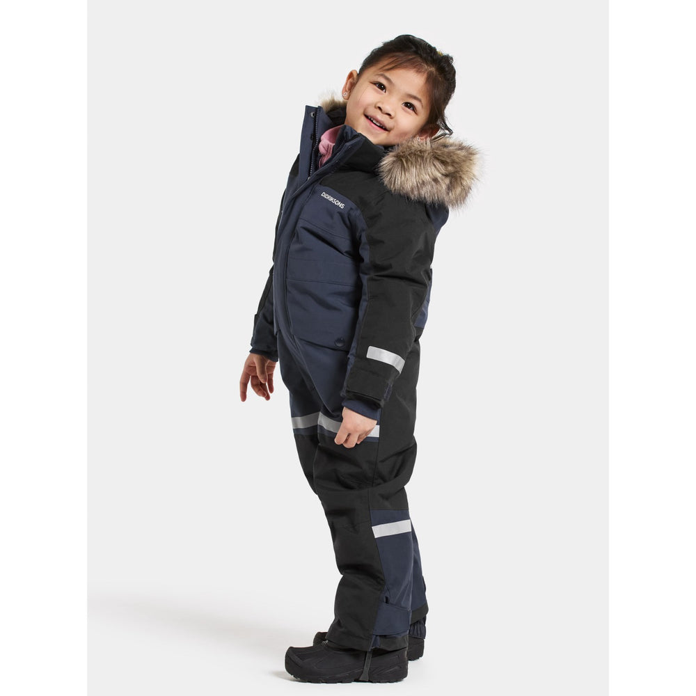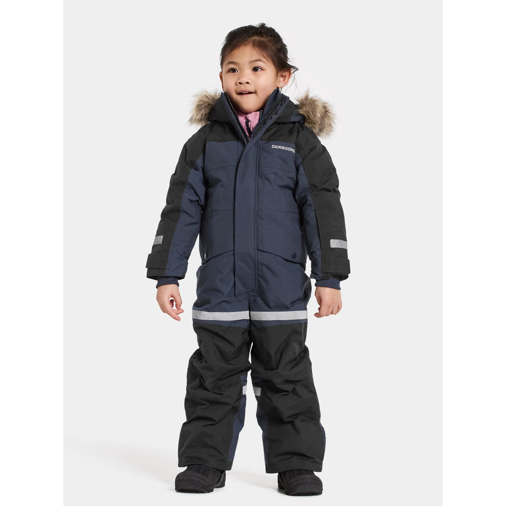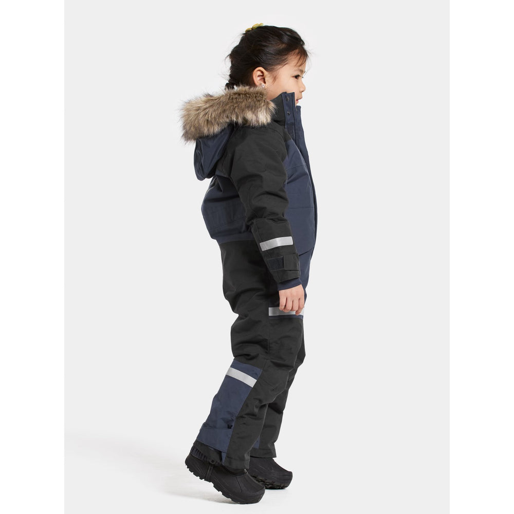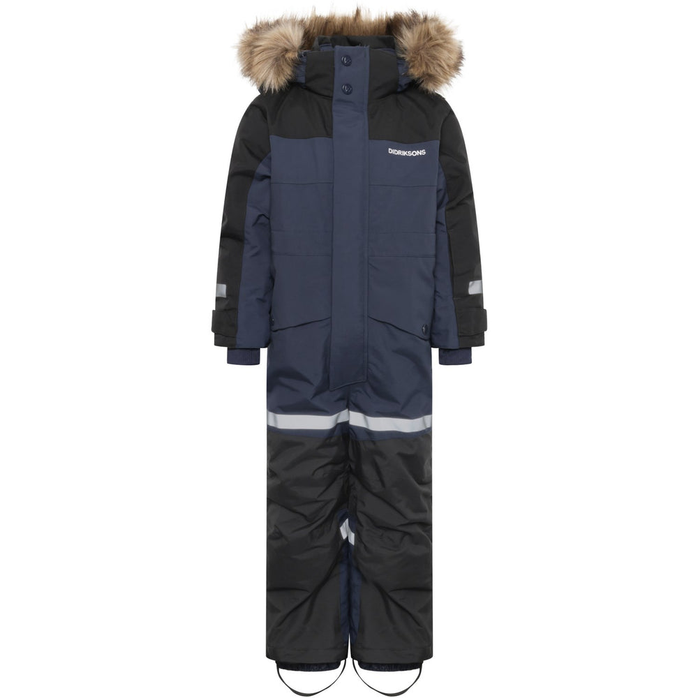 Dress your little adventurer in the Didriksons Navy Bjärven Kids Coverall, expertly crafted for maximum protection and style in snowy conditions. Made with thoughtful fabric mapping for durability and comfort, this coverall features a versatile, detachable hood with synthetic fur and an array of adjustable components for a perfect fit, including the leg ends, waist, and sleeves. The robust navy snowsuit comes adorned with reflective detailing for increased visibility and includes secure pockets for essentials like ski passes. Practical additions such as the glove security loops, thumbholes, and silicone foot straps enhance functionality, while the ergonomic cut ensures free movement. Easy care is ensured with simple washing instructions and an internal name label simplifies ownership. Ideal for endless winter fun, this garment not only keeps children warm and dry but also grows with them, thanks to the extendable size in the legs and sleeves.