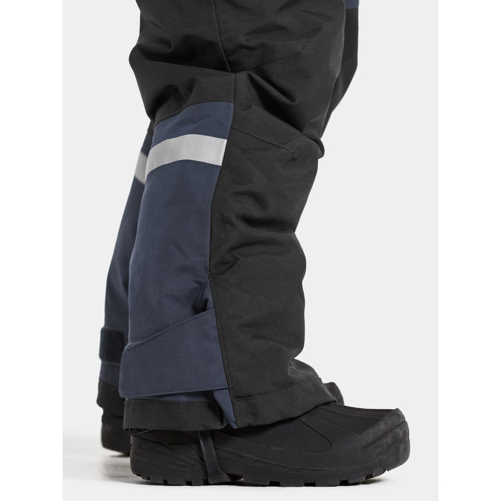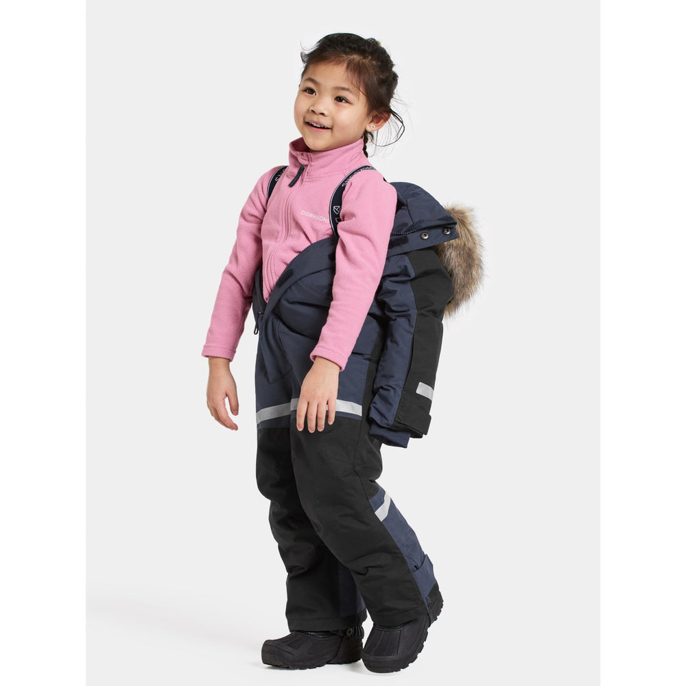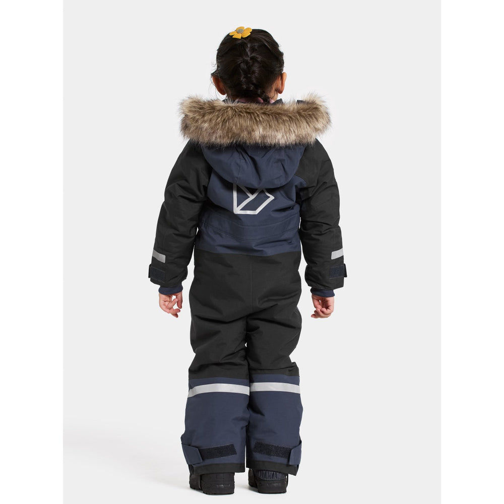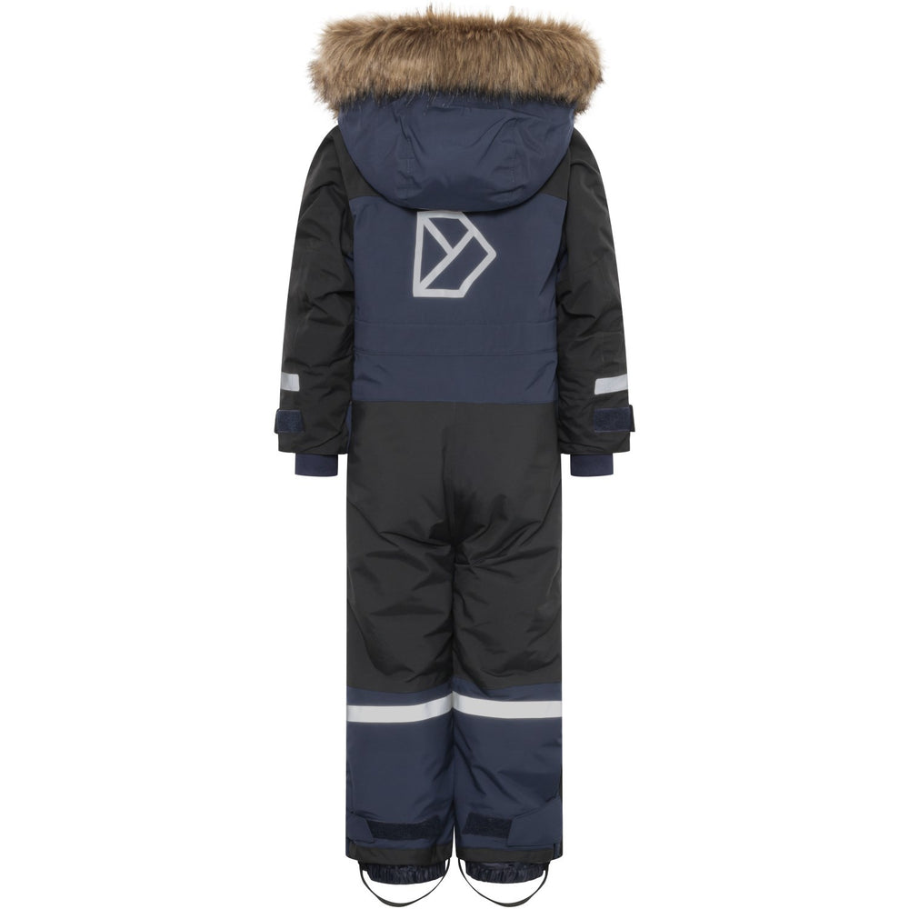 Dress your little adventurer in the Didriksons Navy Bjärven Kids Coverall, expertly crafted for maximum protection and style in snowy conditions. Made with thoughtful fabric mapping for durability and comfort, this coverall features a versatile, detachable hood with synthetic fur and an array of adjustable components for a perfect fit, including the leg ends, waist, and sleeves. The robust navy snowsuit comes adorned with reflective detailing for increased visibility and includes secure pockets for essentials like ski passes. Practical additions such as the glove security loops, thumbholes, and silicone foot straps enhance functionality, while the ergonomic cut ensures free movement. Easy care is ensured with simple washing instructions and an internal name label simplifies ownership. Ideal for endless winter fun, this garment not only keeps children warm and dry but also grows with them, thanks to the extendable size in the legs and sleeves.