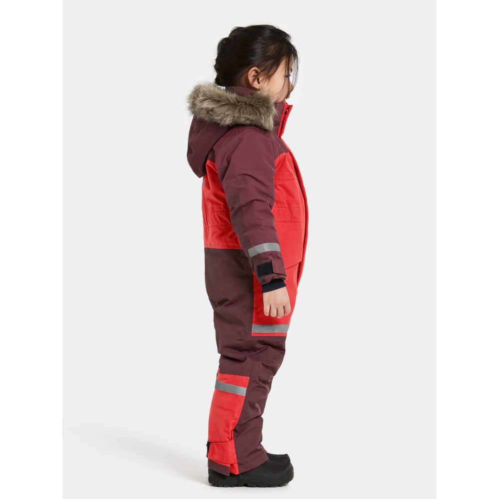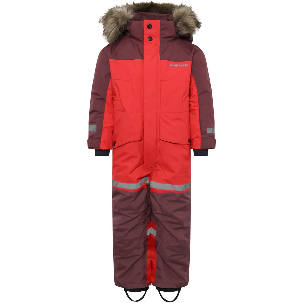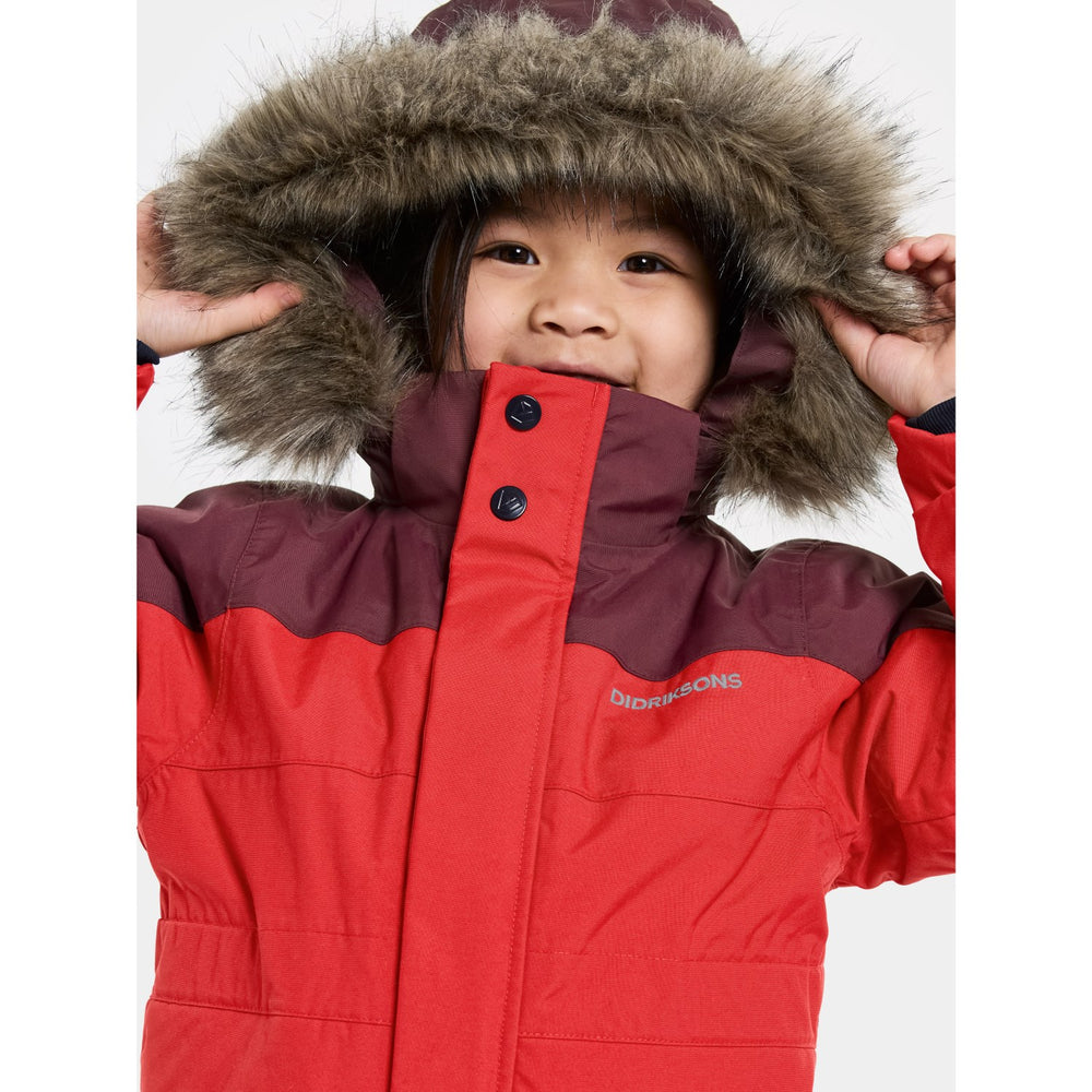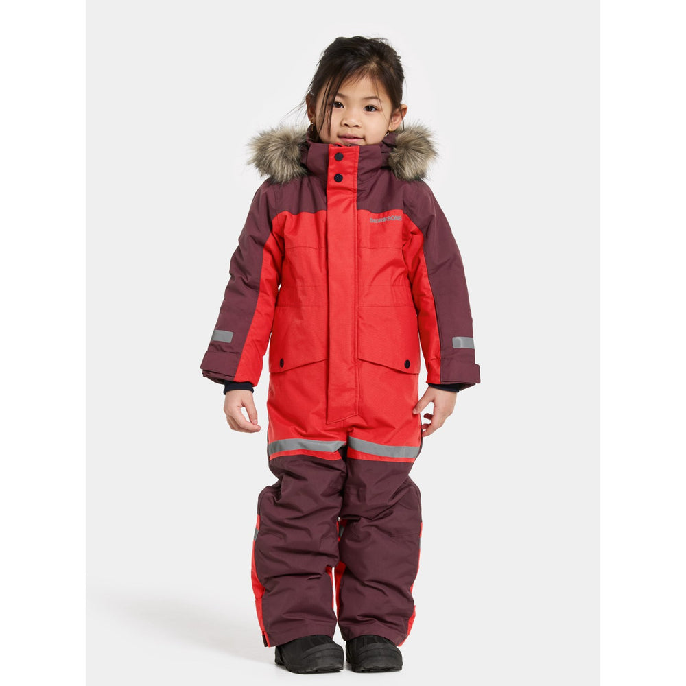 Discover the ultimate protection and style for your little adventurers with the Didriksons Pomme Red Bjärven Kds Cover 4 snowsuit. Expertly crafted with an ergonomic cut and featuring a robust fabric mapping technique, this snowsuit boasts an adjustable and detachable hood with synthetic fur, ensuring your child stays warm and adaptable to any winter weather condition. The bright red hue and reflective logos enhance visibility, while the adjustable leg ends with silicone foot straps and snow gaiters keep the snow out, ensuring complete dryness and comfort.