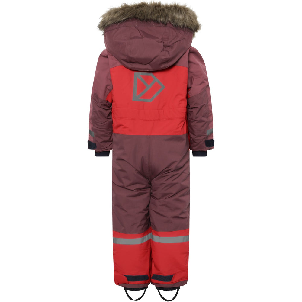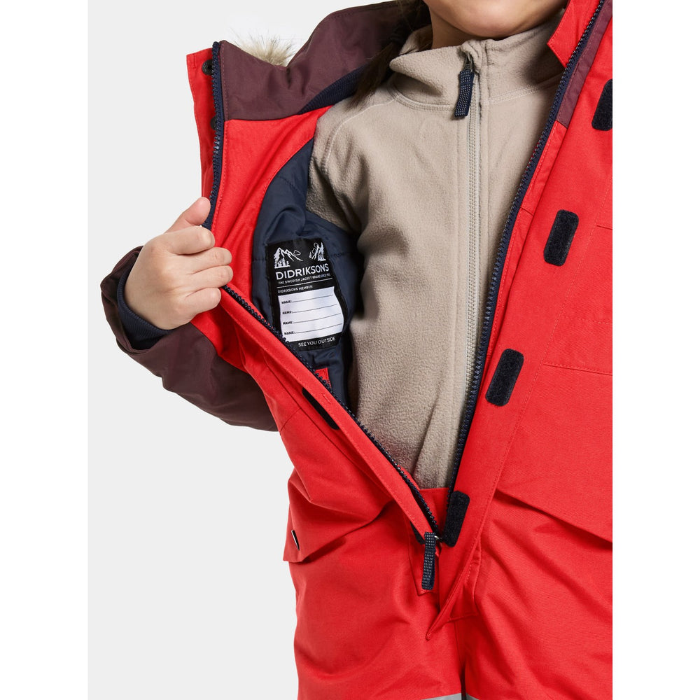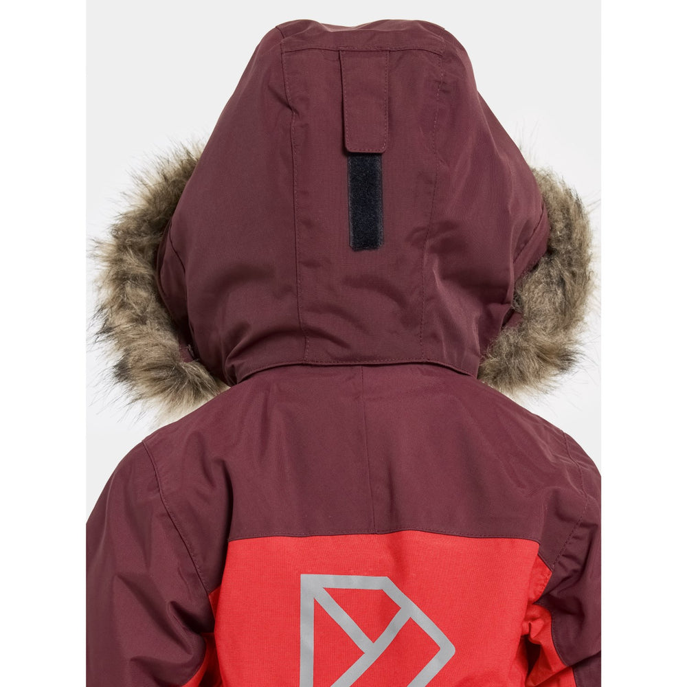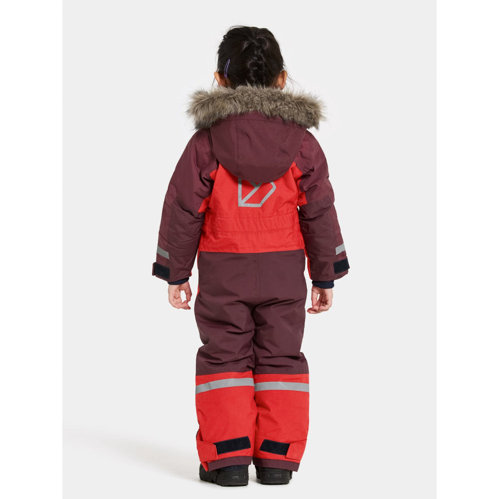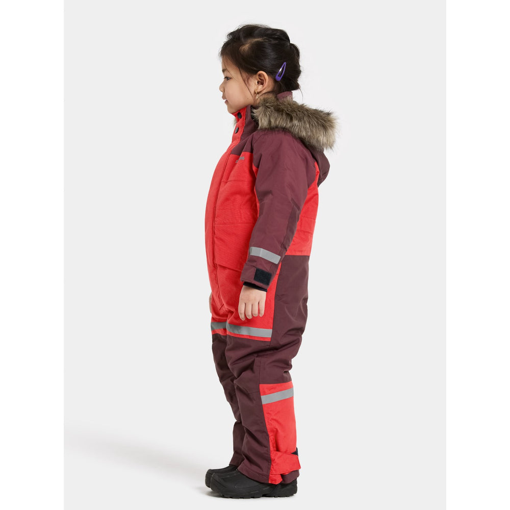 Discover the ultimate protection and style for your little adventurers with the Didriksons Pomme Red Bjärven Kds Cover 4 snowsuit. Expertly crafted with an ergonomic cut and featuring a robust fabric mapping technique, this snowsuit boasts an adjustable and detachable hood with synthetic fur, ensuring your child stays warm and adaptable to any winter weather condition. The bright red hue and reflective logos enhance visibility, while the adjustable leg ends with silicone foot straps and snow gaiters keep the snow out, ensuring complete dryness and comfort.