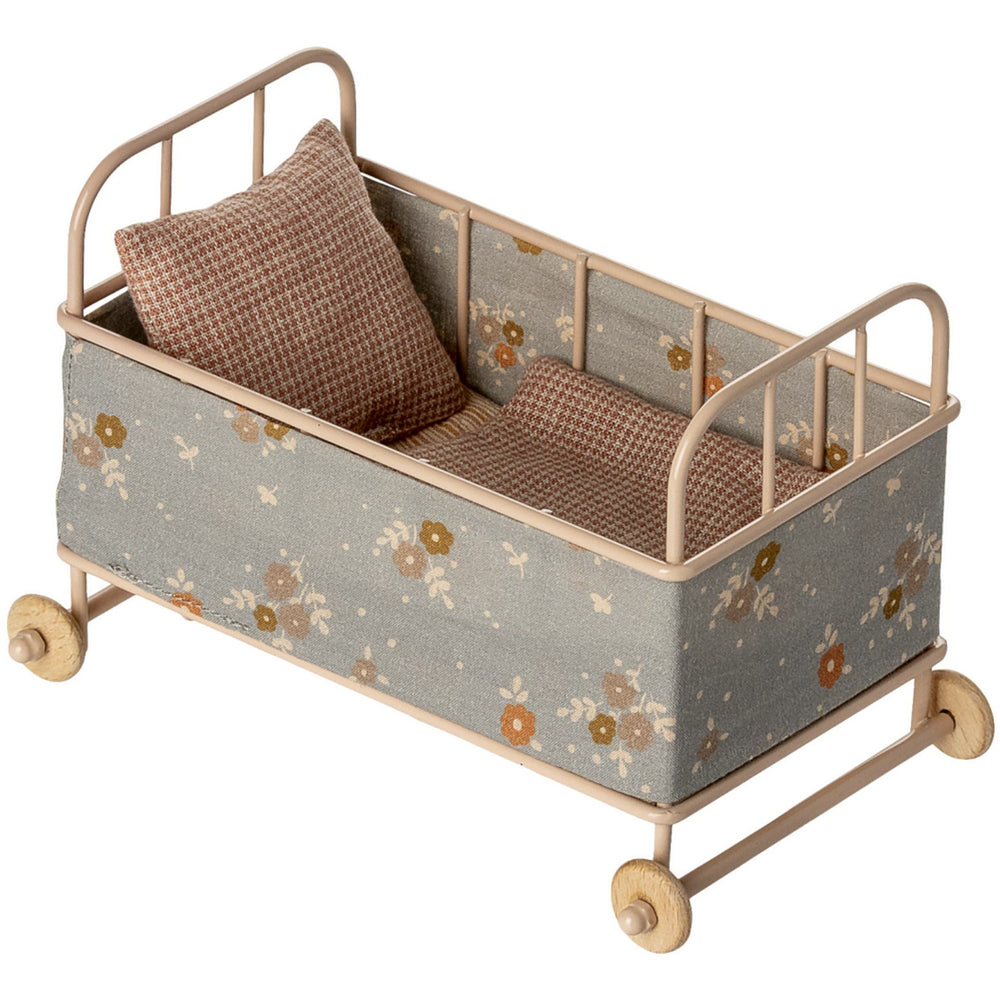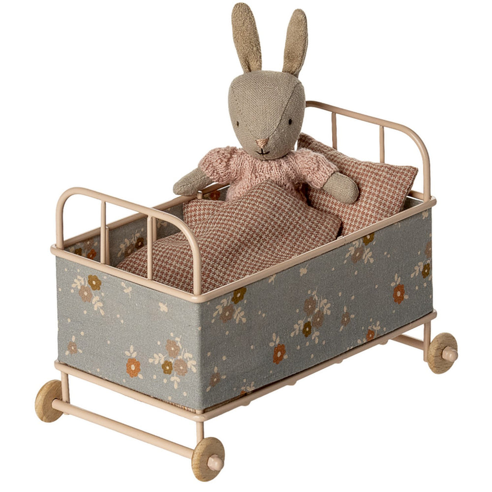 Delight your child with the charming Maileg Tremmeseng Micro in Pudder, a beautifully designed doll accessory. This cosy metal cot comes complete with a soft mattress, blanket, and pillow, providing a perfect snooze spot for micro-sized friends and little mice. Its fabric cover enhances safety and warmth, making it an ideal choice for enhancing imaginative play in children aged 3 years and up. Lightweight and easy to set up, this doll cot offers hours of fun and develops nurturing skills, making it a splendid addition to any playroom.