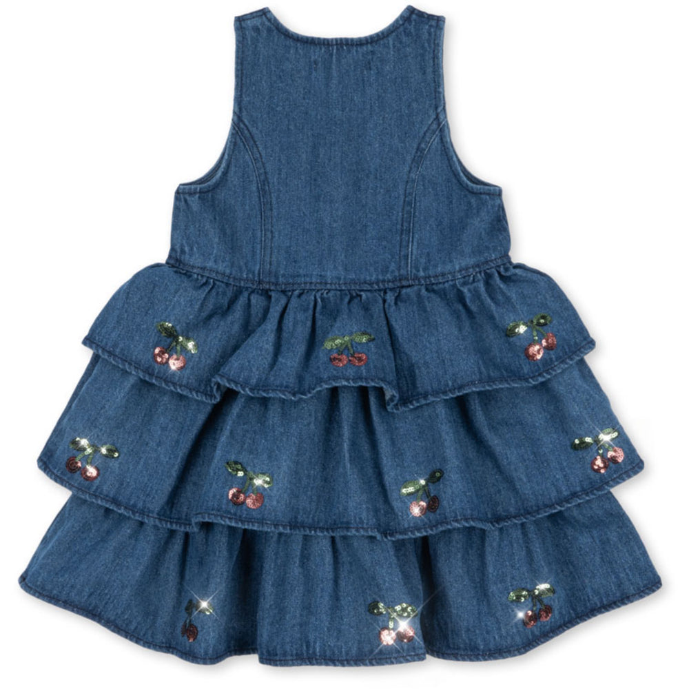 Introducing the charming Konges Sløjd Denim Blue Elba Dress, a delightful choice for any child's wardrobe. This denim dress features a beautifully tiered skirt adorned with embroidered sequin cherries, adding a touch of whimsy. Crafted with a comfortable round neckline and convenient button closure, it combines style with ease of wear. Perfect for both everyday adventures and special occasions, this dress promises both durability and easy care.