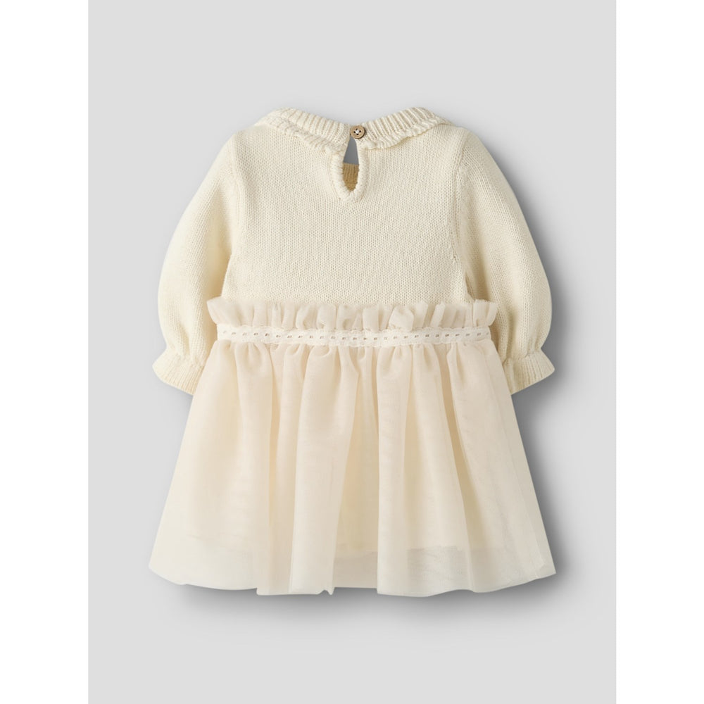 Explore the delightful charm of the Lil'Atelier Pistachio Shell Nbfsarina Ls Knit Body Dress, a perfect blend of style and comfort for your little one. This dress features a round neck with soft, long sleeves adorned with frilled cuffs, adding a touch of whimsy. Fashioned from knit fabric known for its soft feel, it ensures your child stays comfortable throughout the day. Practical yet chic, it includes both button and loop and press stud fastenings for easy dressing.