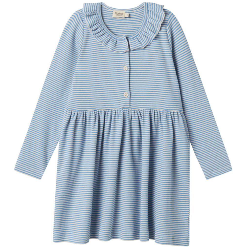 Discover the charm of the MarMar Modal Fine Rib Blue Stripe Dama LS Dress, perfect for your little one. Crafted from soft modal fabric, this long-sleeved dress features a delightful blue stripe design with a stylish collar and handy button closure. The dress's above-knee length ensures both comfort and freedom of movement, making it ideal for playdates or special occasions. Easy to care for and irresistibly cute, it's a wardrobe must-have that blends functionality with fun. Materials: 47% Modal 48% Cotton (Organic) 5% Elastane Washing instructions: Wash - Machine wash 40°C , Bleach - Do not bleach , Drying - Do not tumble dry, Ironing - medium, Dry Clean - Dry clean possible Certifications: OEKO-TEX, Organic cotton, LENZING Modal, SMETA Fine rib knit with elastane Soft, stretchy and comfortable to wear Breathable quality Keeps shape and color Oeko-tex® - Tested for harmful chemicals