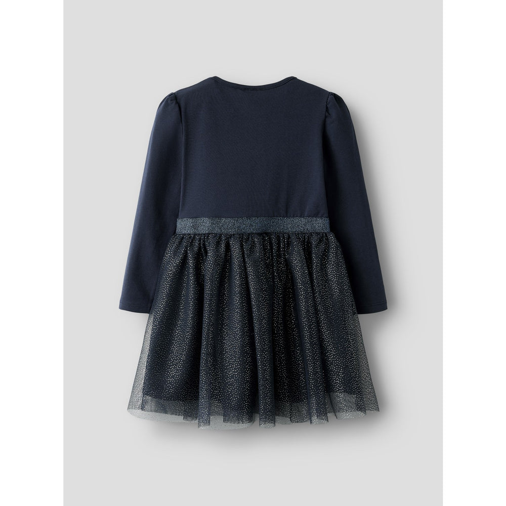 Brighten up your little girl's wardrobe with the Name It Navy Blazer Nmfosimi Frozen LS Tulle Dress Wdi, a stunning piece that captures the magical essence of Disney's Frozen. This dress features a charming rubber print with a soft feel that vividly brings to life the adventurous spirit of the beloved sisters' tale. Designed with a comfortable round neck and enchanting long puff sleeves, it ensures your child stays cozy while looking absolutely adorable.