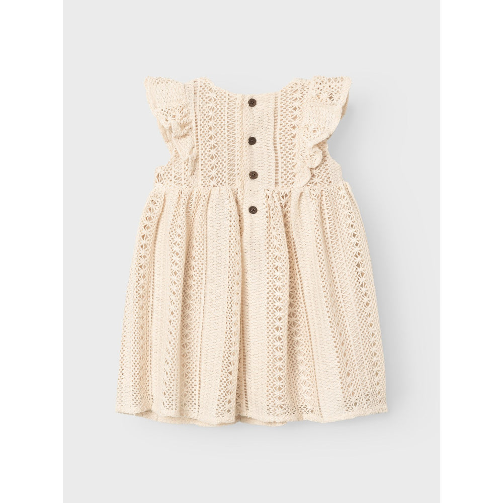 Dress your little one in the charming Hisilka Spencer Dress by Name It, ideal for embracing those sunny days and balmy evenings. This sleeveless dress features a classic round neck and a smart button fastening at the back, combining ease with style. Crafted from exquisite lace, it showcases open intricate designs that lend a touch of elegance to the overall appearance, highlighted by an elasticated waist that ensures a snug yet comfortable fit. The dress is short in length and comes with a soft cotton lining, which guarantees it remains non-transparent while enhancing comfort. The oatmeal color and tasteful lace detail add a fashionable flair that stands out in both simplicity and style. Durable and easy to care for, this piece promises to keep up with your child’s activity and remain in fabulous condition. Perfect for any dressy occasion or casual outing, the Hisilka Spencer Dress is not just about looks but also about providing lasting comfort and functional wearability, making it a delightful addition to your child's wardrobe.