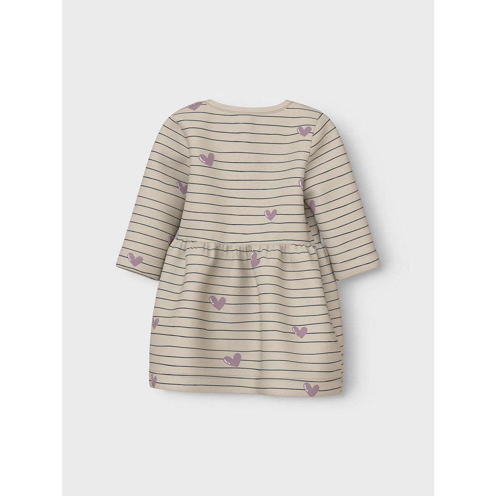 Dress your little one in the adorable 'Name It Summer Sand Hearts Vandora Dress' for both style and comfort. Crafted from jersey, a soft and stretchy fabric, this dress ensures a cozy fit with ample freedom for movement. Featuring a charming all-over heart print, the dress comes complete with a convenient press stud fastening, long sleeves, and a classic round neck. Its regular fit and easy-care material make it a practical choice for both everyday wear and special occasions. Ideal for kids who love to play and explore, this dress combines functionality with cute, eye-catching design.