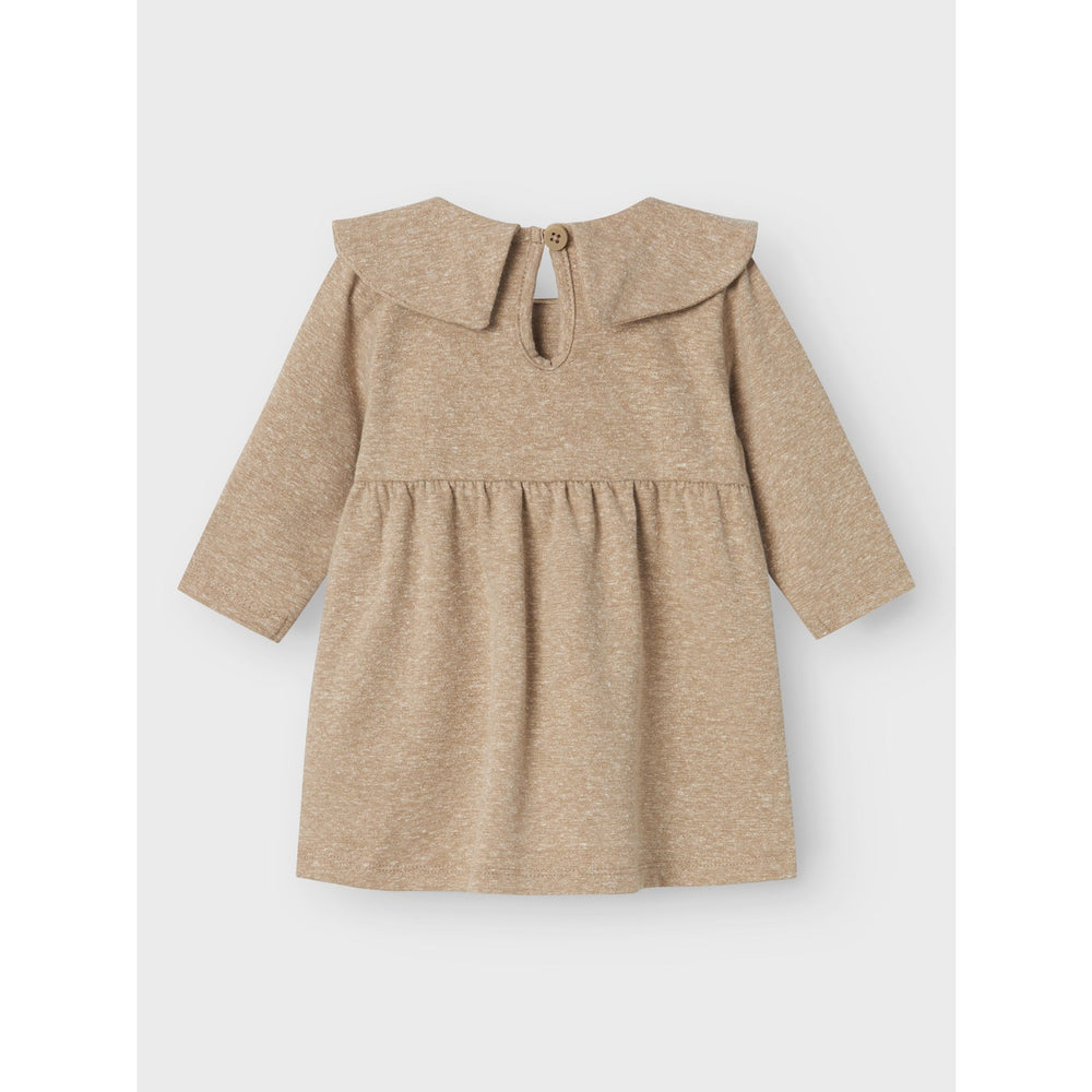 Introducing the Name It Weathered Teak Rossia Dress, a charming addition perfectly suited for your little one's everyday adventure. Crafted from luxurious jersey fabric, this dress offers both lightweight comfort and sufficient stretchiness, ensuring your child can move freely and comfortably. The soft surface and inside add to the overall coziness, making it ideal for year-round wear.