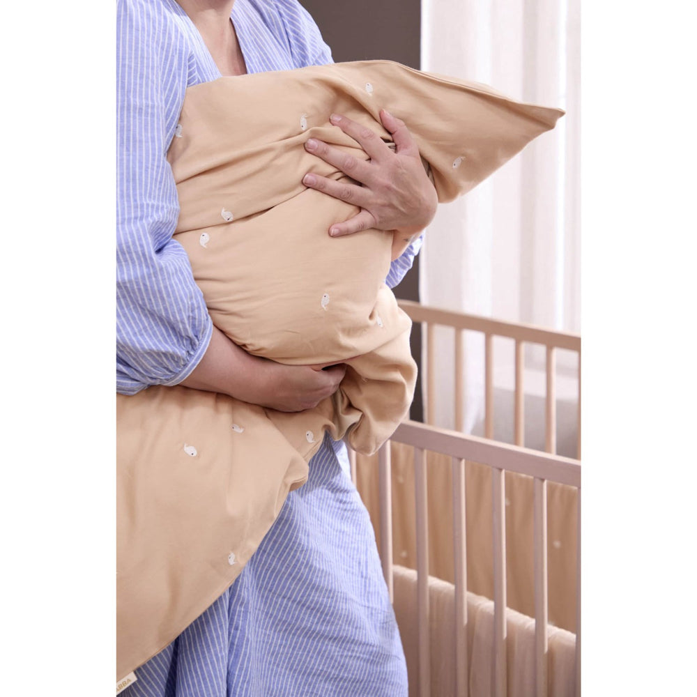 Bring comfort and delicate design into your child's room with the FILIBABBA Warm Grey Bed Linen set, featuring our beloved Christian the Whale. This 100% organic cotton bedding, certified by GOTS (CERES-0300), promises a safe, hypoallergenic environment for your little ones. Each set includes a 70 x 100 cm duvet cover and a 40 x 45 cm pillowcase, both expertly designed with a whimsical whale embroidery on one side and a soothing plain beige on the other, ensuring comfort throughout the night.