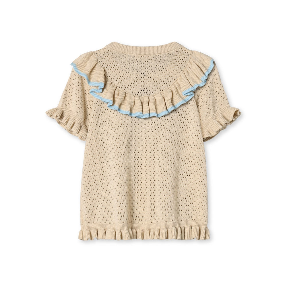 Step into sweetness with the Fliink Sandshell Emmy Blouse! Crafted from 100% organic cotton, this darling top features an intricate pointelle pattern with charming ruffles adding a playful twist. Its round neckline and puff sleeves accentuate a whimsical silhouette, while contrasting blue edges on the shoulder ruffles dial up the cute factor. Perfect for a picnic or a party, this blouse makes any day special. Keep it lovely longer by washing gently and laying flat to dry. A true treasure in any little one's wardrobe!