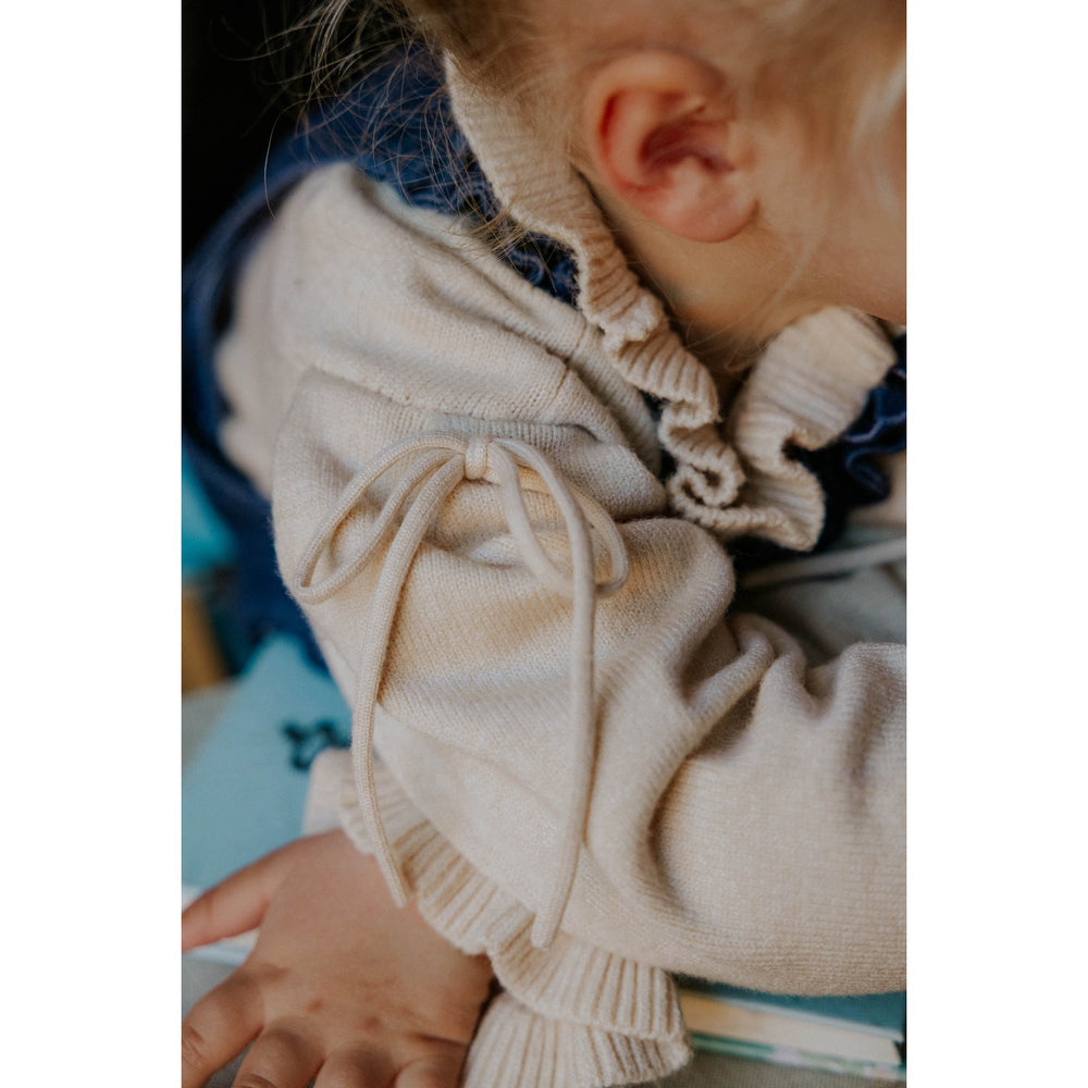 Discover the charming Fliink Sandshell Kino Ls Knit Blouse, an exquisite choice for your child's wardrobe. Crafted from a blend of 50% LENZING™ ECOVERO™ viscose, 27% nylon, and 23% polyester, this garment features a gentle, round-knitted yoke adorned with lovely ruffles along the neck, sleeves, and hem. The added tie bands on the shoulders infuse a whimsical touch, enhancing its elegant style. Presented in a versatile color scheme, this blouse shines in both casual settings and more festive occasions. Its loose fit ensures ease of movement, making it a staple of comfort and style. For maintenance, simply machine wash at 30°C on a delicate cycle and dry flat to preserve its quality and softness. This fashionable blouse not only brings a sophisticated flair to both pants and skirts but also supports environmentally responsible fashion practices, making it a smart and stylish choice for modern parents.