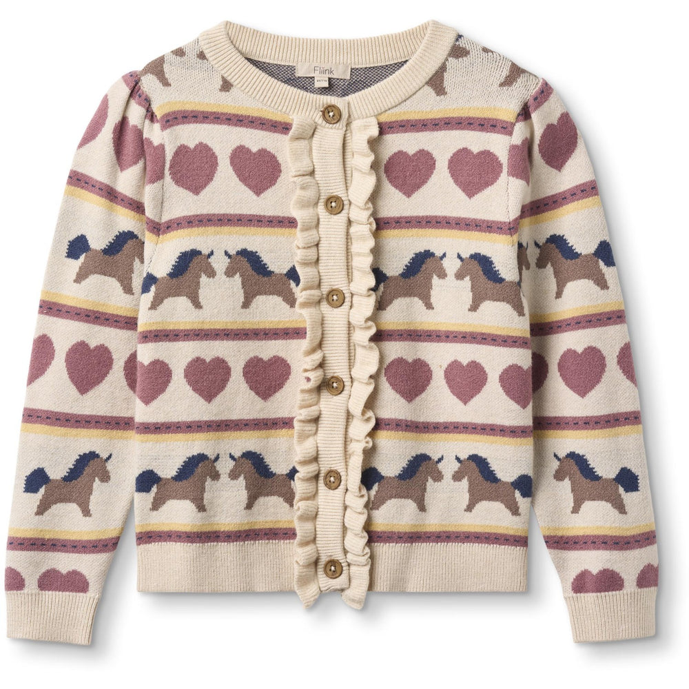 Dress your little one in the Fliink Sandshell Kino Ls Multi Cardigan, a charming ensemble for lovers of whimsy and warmth. This knitted cardigan features an adorable horse and heart pattern set against a palette of soothing, warm colors, making it perfect for children with a love for animals. Designed with a classic round neck and enhanced with fine ribbing and a delightful ruffled edge along the button placket, this cardigan blends style with sweetness.