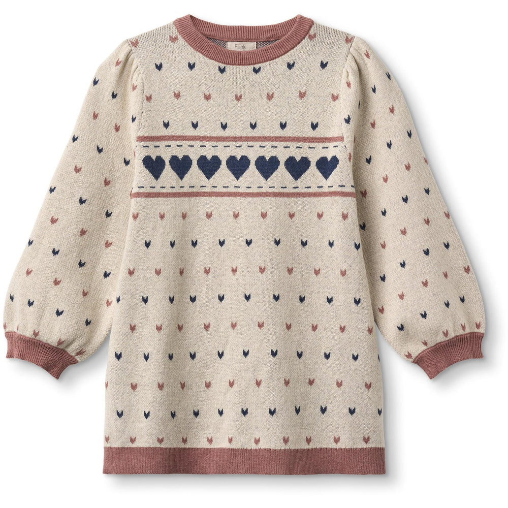 Discover the charm of the Fliink Sandshell Nova Multi Heart Dress, crafted from a cozy blend of 85% organic cotton and 15% wool. This knitted dress features a delightful jacquard pattern of hearts, adding a touch of whimsy to your child's wardrobe. Its comfortable round neck and voluminous balloon sleeves with ribbed wrist details ensure a stylish yet cozy fit. Designed to hit at the knee, it matches ease with elegance. Practical for everyday wear, this dress is machine washable and easy to care for, ensuring it stays beautiful without hassle. Perfect for playful days and special occasions alike, it combines fashion with function in a timeless style.