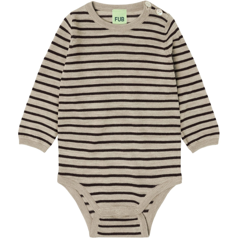 Introducing the FUB Oat Melange/Mocca Baby Body, a timeless piece knitted in lightweight single jersey for your little one's comfort and style. This classic striped bodysuit is crafted from 100% OEKOTEX®, RWS, and BLUESIGN® certified merino wool, ensuring it's free from harmful chemicals and sourced ethically. Featuring long sleeves, a cozy round neckline, and ribbed hems, each detail adds to its charming look. Functional elements include easy-to-use pearl shell button closures at the shoulder and snap fasteners at the crotch for quick changes. Plus, the special eco-friendly treatment allows for hassle-free machine washing. Perfect for playful days and peaceful nights, this baby body combines durability, comfort, and style effortlessly.