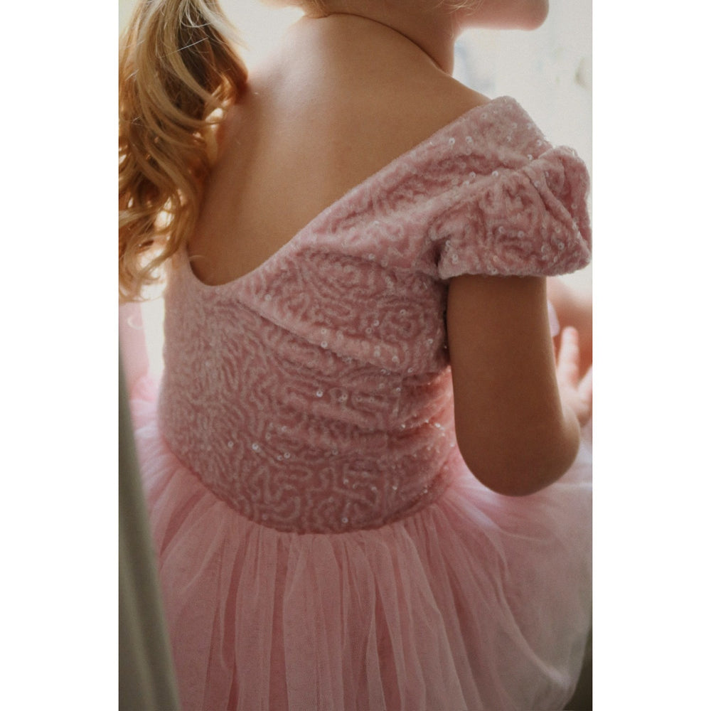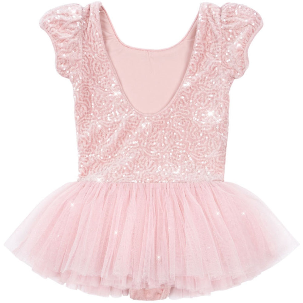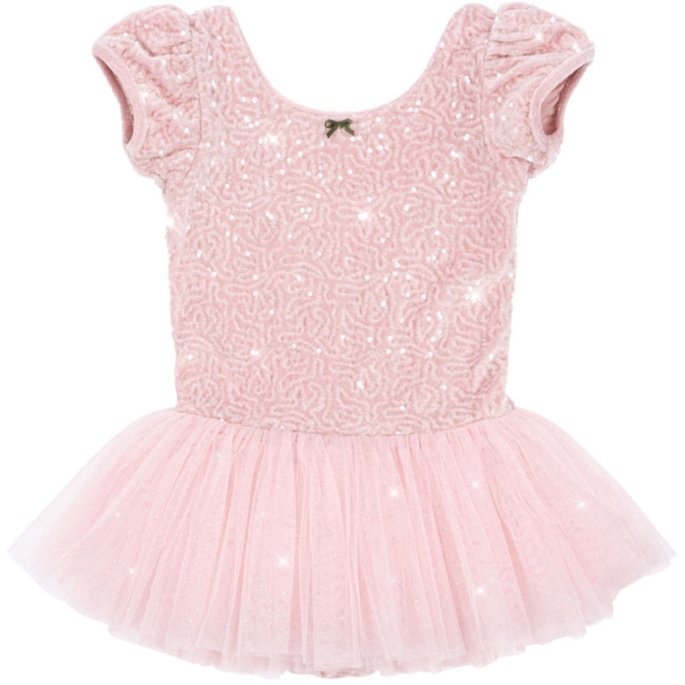 Introducing the Konges Sløjd Ash Rose Ballerina Dress, a dream come true for young dance enthusiasts. This classic tutu-styled dress features a voluminous tulle skirt adorned with decorative sequins, combined with a fitted suit made from stretchy performance fabric for optimal comfort and movement. The soft ash rose color and charming puff sleeves add a touch of elegance, while the low scoop back ensures a snug fit. Perfect for recitals, dress-up days, or any event where a little sparkle is required, this dress is designed to make your little one feel like the star of the show. Easy to care for, it promises to keep its enchanting allure wear after wear.