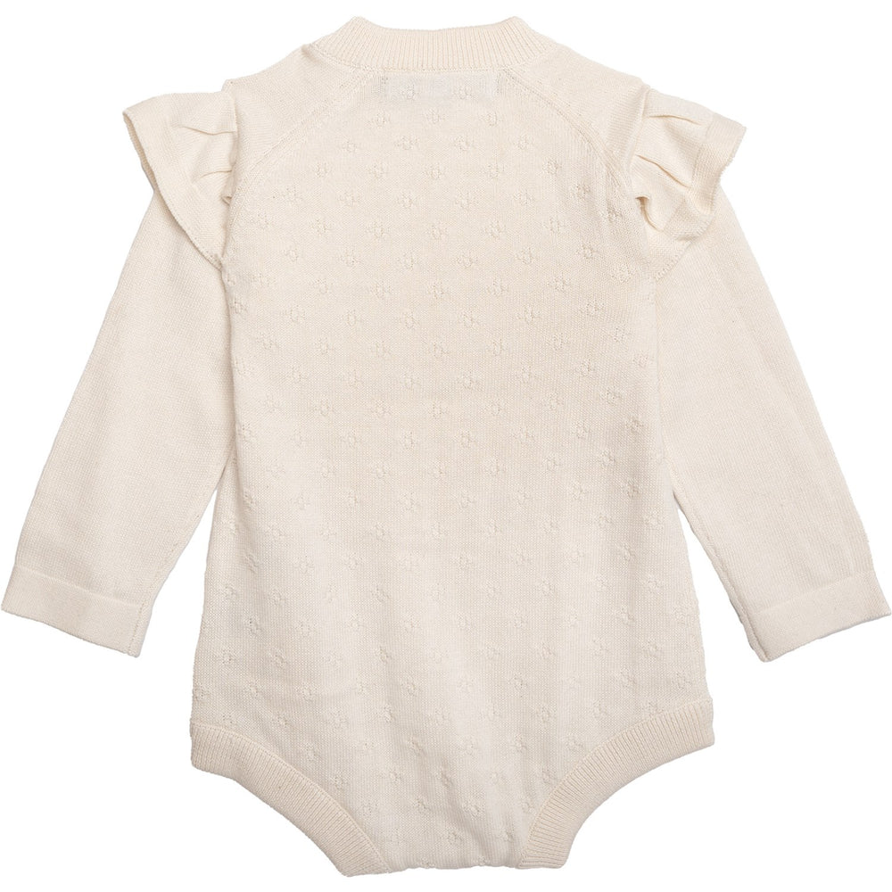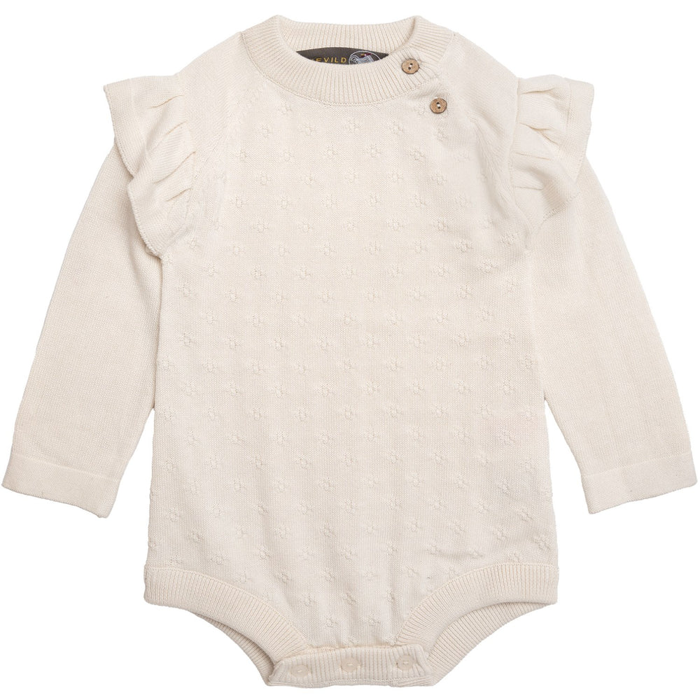 Welcome the charming Hanevild Ivory Lucy Romper into your little one's wardrobe, a cream-colored delight crafted from 100% organic cotton. Featuring elegant shoulder ruffles and a captivating pattern, this romper combines style with practicality, securing with easy-access buttons at the neck and bottom. Perfect for gentle skin, it's designed for comfort and ease of wear, washing beautifully at 30 degrees Celsius. Delight in its softness and stylish functionality, perfect for playdates or photo-ops!