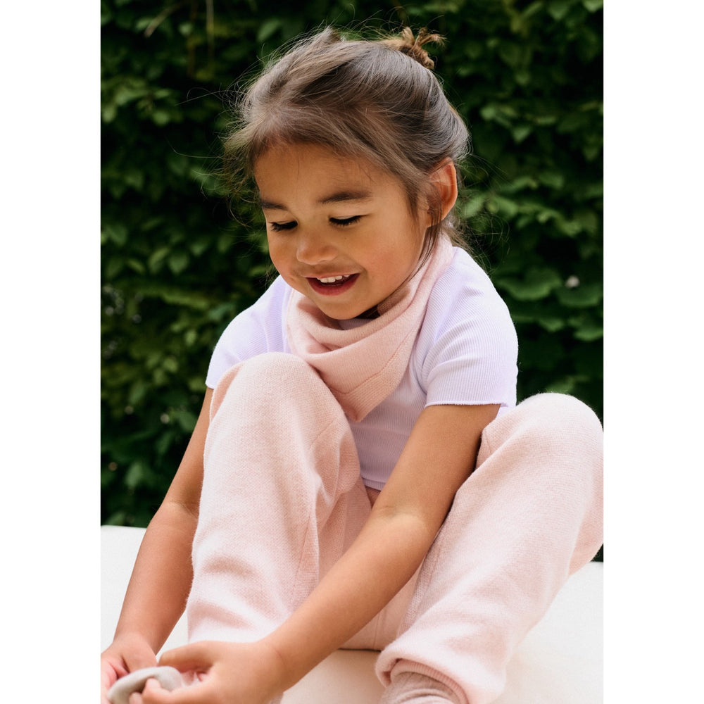 Wrap your child in the luxurious warmth of the HOLMM Powder Foty Cashmere Scarf, an impeccably soft and lightweight accessory that offers both sophistication and versatile functionality. Crafted from 100% premium cashmere, this scarf ensures a featherlike touch while providing the necessary warmth that stands up to chilly days. Featuring a unique triangular shape, accented by a beautifully textured knitted stitch border, it easily transitions from a cozy shoulder shawl to a snug scarf or a comforting blanket for naptime cuddles.