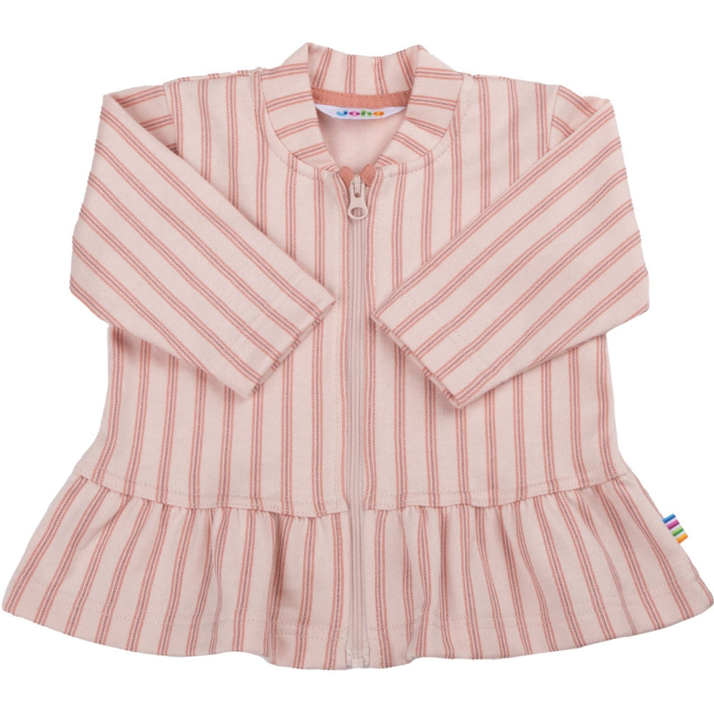 Dress your little one in the cozy embrace of the Joha Pink Jacket, perfectly designed to keep them snug and stylish. This jacket features a charming striped print in a lovely shade of pink, adding a vibrant touch to your child's wardrobe. With a practical front zipper for easy dressing and a delightful ruffle detail at the bottom, this piece combines functionality with playful design.