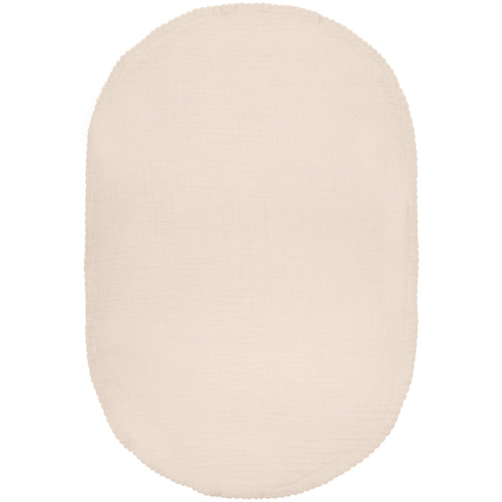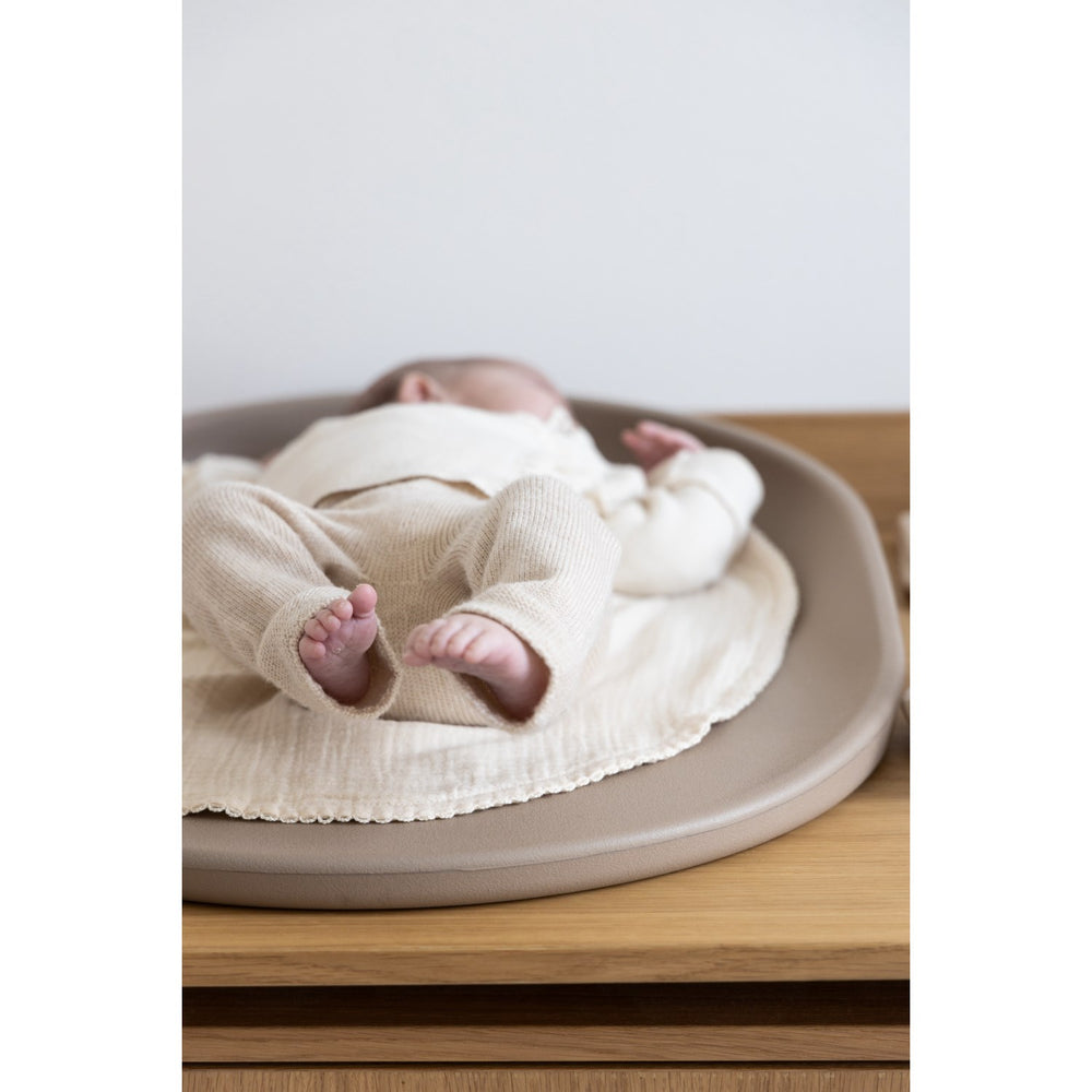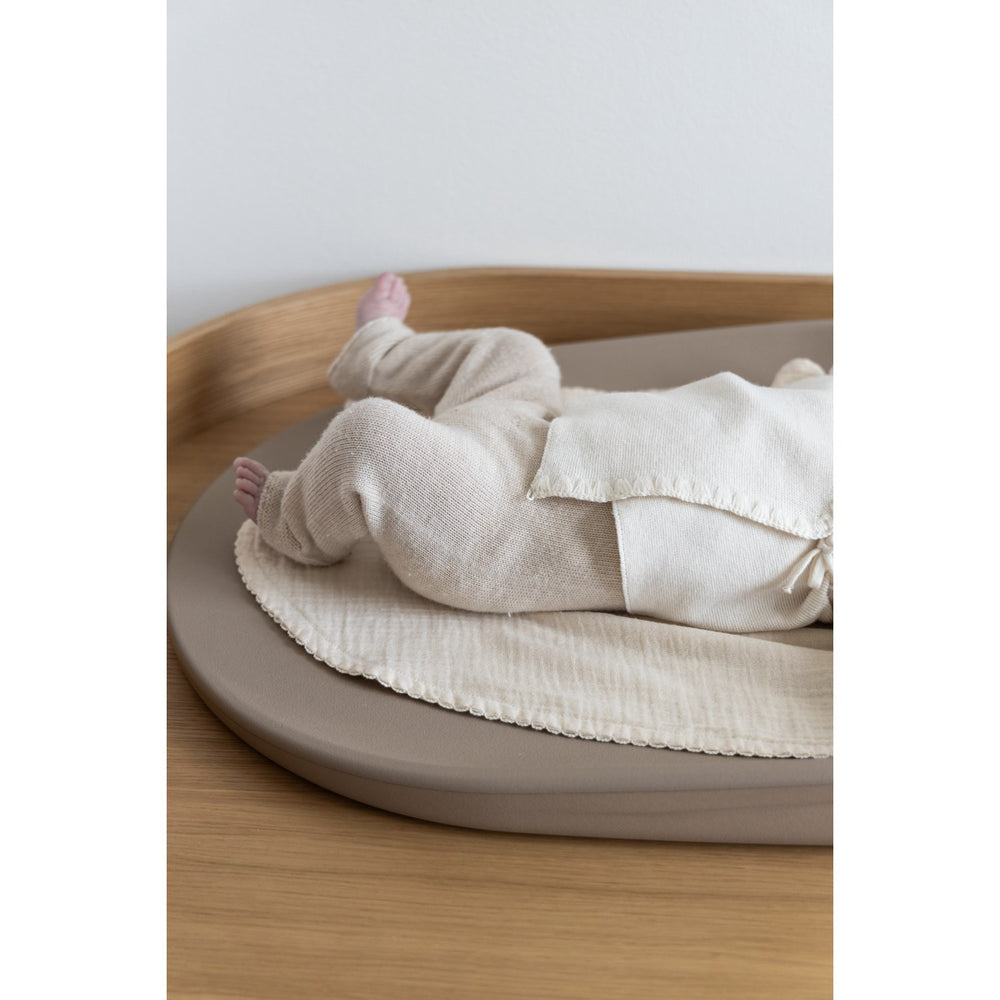 Discover the gentle comfort of the KAS Kopenhagen Cream Kai Pusleunderlag, a set of two oval, reversible changing mats designed to complement our Kai changing pad seamlessly. Each mat, adorned with an elegant lace edge, is crafted from four layers of 100% organic muslin cotton, ensuring it's not only extra thick but also superbly soft and highly absorbent. These cream-colored mats perfectly match our KAI furniture collection and other textiles, making them an aesthetic and functional choice. Ideal for keeping your little one comfortable and protected during changes, these mats are also easy to maintain and store, enhancing your nursery with both charm and practicality.