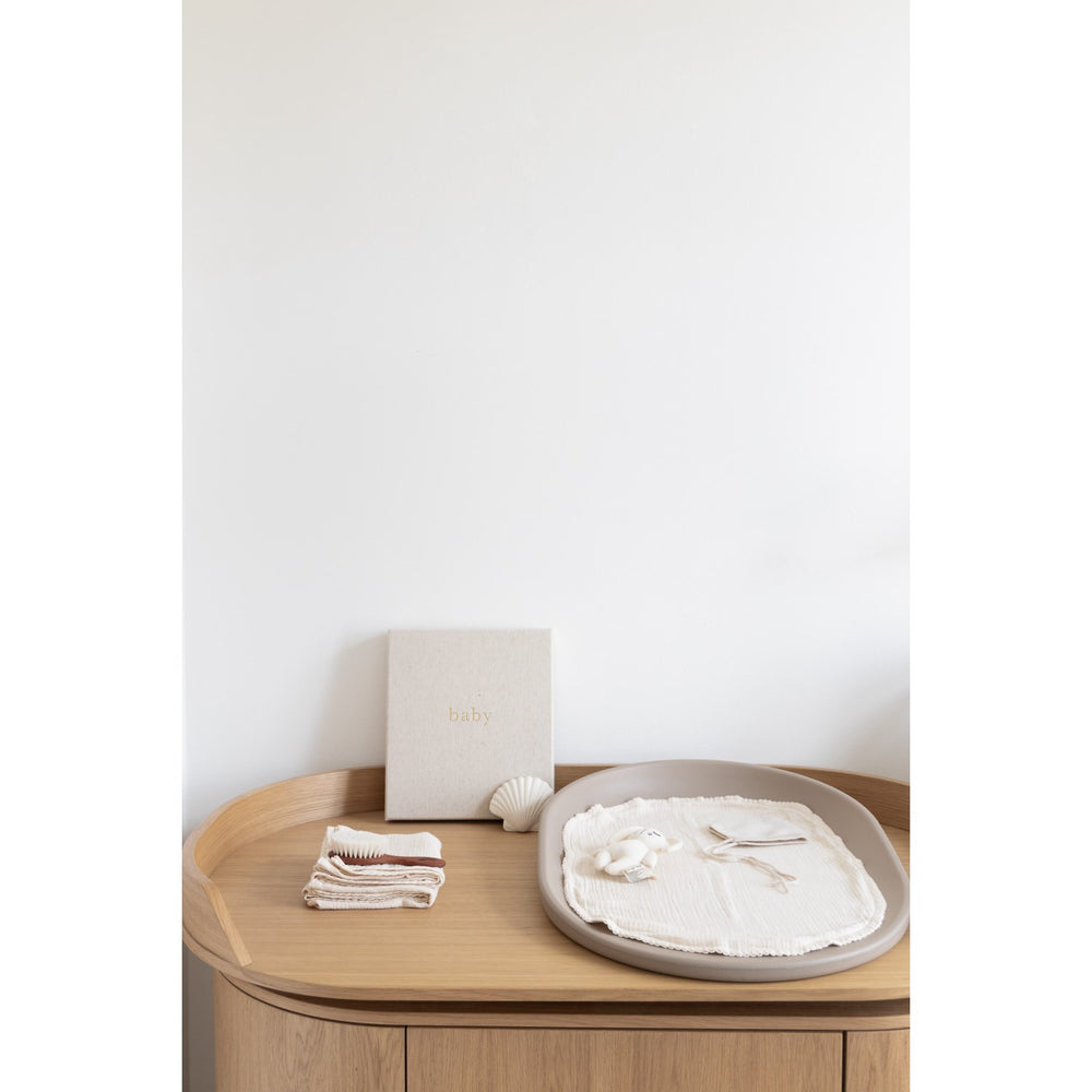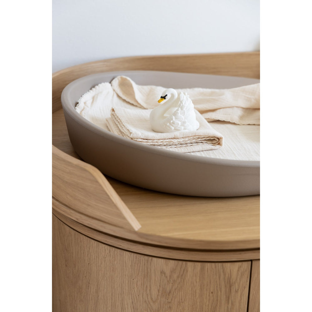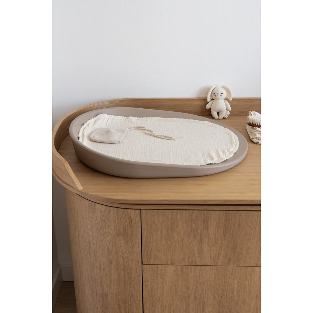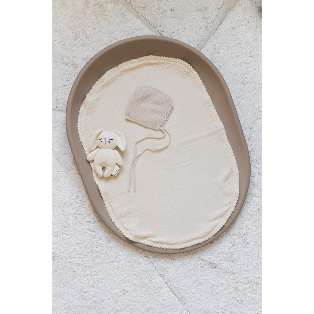 Discover the gentle comfort of the KAS Kopenhagen Cream Kai Pusleunderlag, a set of two oval, reversible changing mats designed to complement our Kai changing pad seamlessly. Each mat, adorned with an elegant lace edge, is crafted from four layers of 100% organic muslin cotton, ensuring it's not only extra thick but also superbly soft and highly absorbent. These cream-colored mats perfectly match our KAI furniture collection and other textiles, making them an aesthetic and functional choice. Ideal for keeping your little one comfortable and protected during changes, these mats are also easy to maintain and store, enhancing your nursery with both charm and practicality.