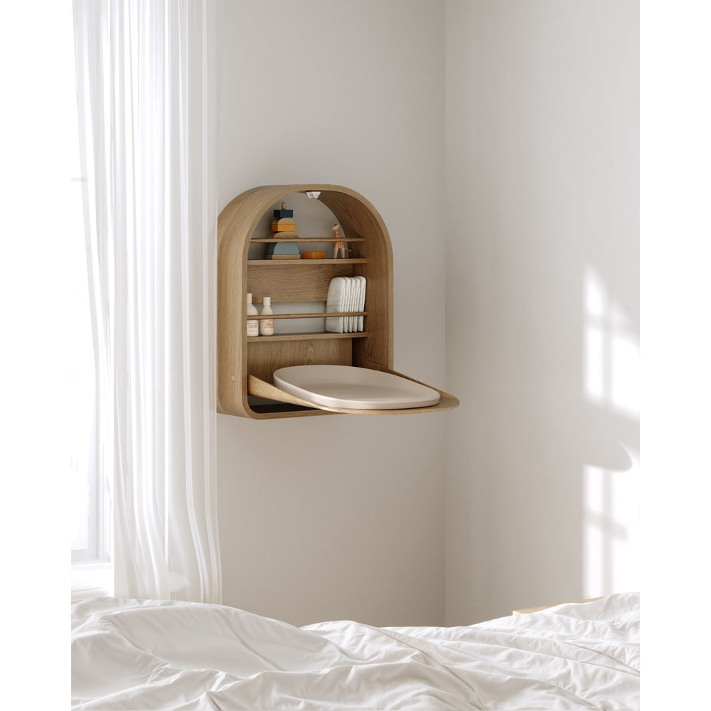 Discover the elegance and practicality of the KAS Kopenhagen Natural Oil Kai Wall Changing Table in Natural Oil. Designed specifically for modern, compact living spaces, this wall-mounted changing table features a sleek, round design that not only saves space but also enhances your nursery's decor. The innovative Easy Touch system allows for smooth opening and closing, ensuring that the table is both user-friendly and accessible.