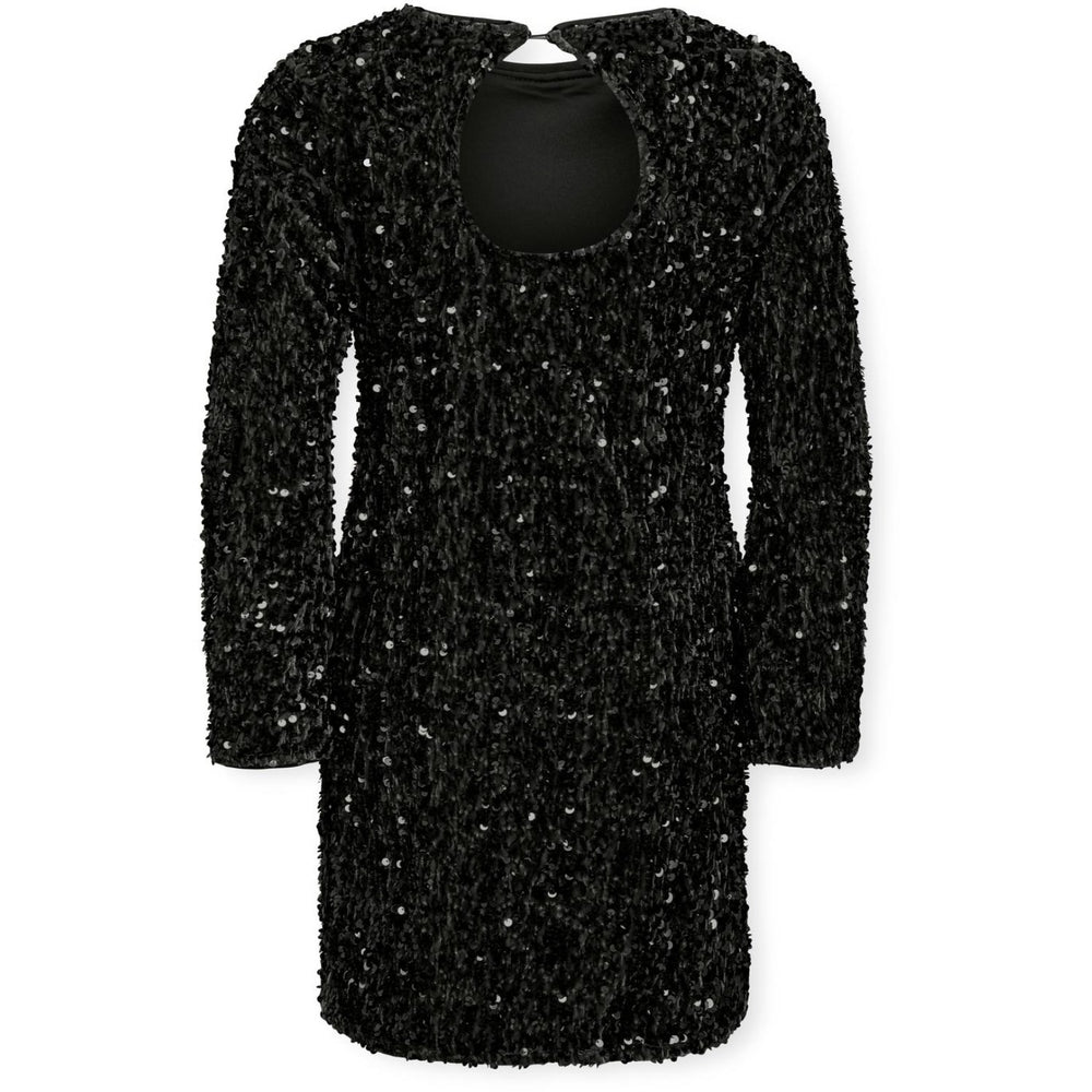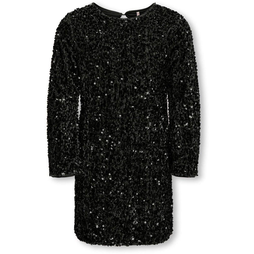 Dress your young one in the epitome of cool with the KIDS ONLY Black Kogconfidence Life Ls Seq Flrd Dress Jrs. This bodycon fit dress features a captivating round neck, long sleeves, and is adorned with dazzling sequins. Crafted for comfort, its short length makes it perfect for any occasion. A must-have for stylish, playful wardrobes.