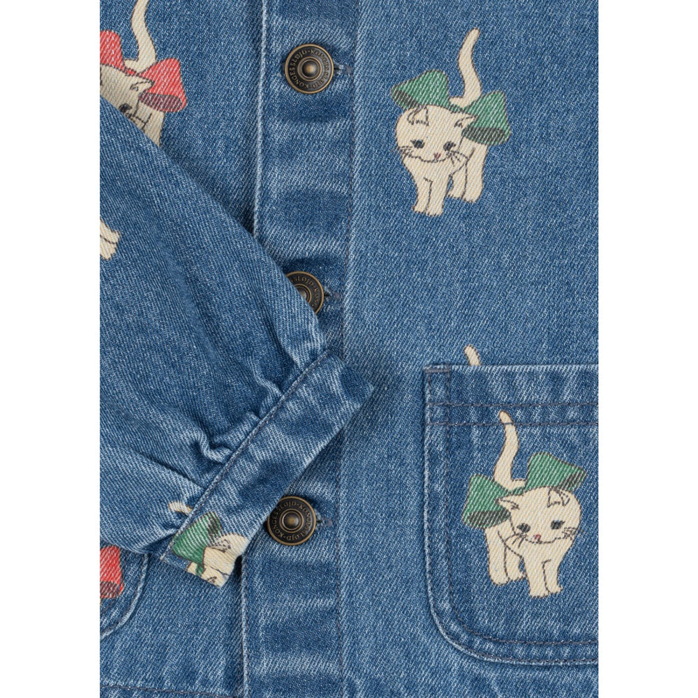 Discover the charm of the Konges Sløjd Bow Kitty Denim Magot Collar Jacket. Crafted from soft GOTS-certified organic cotton denim, this delightful shirt jacket features a straight fit, a chic round collar, and practical front pockets. Its adorable design and thoughtful details make it perfect for any fun outing or cozy day in. With its easy-care fabric and comfortable wearability, it’s sure to become a beloved part of any child's wardrobe. Materials: 100% Organic Cotton