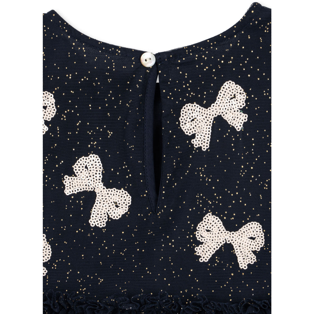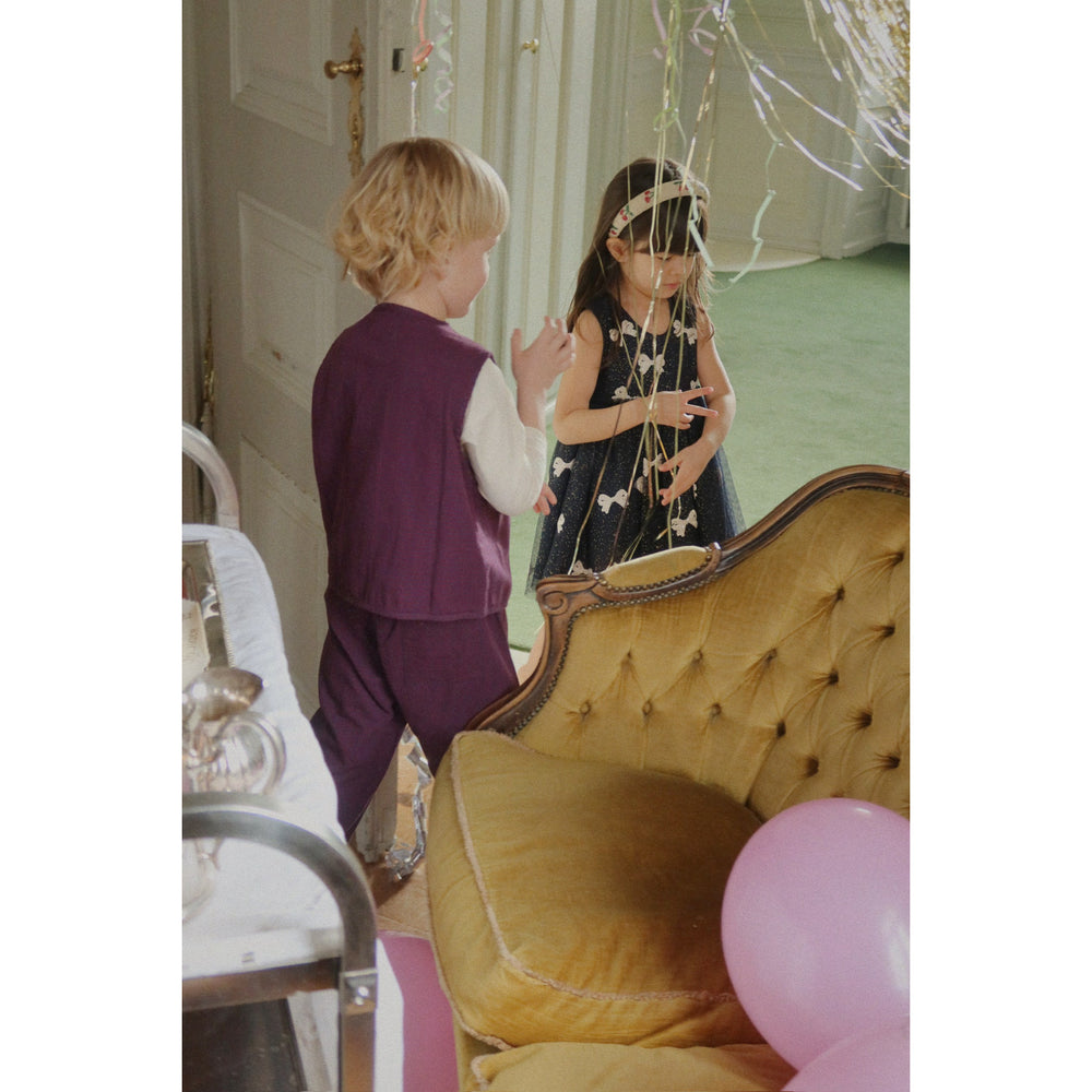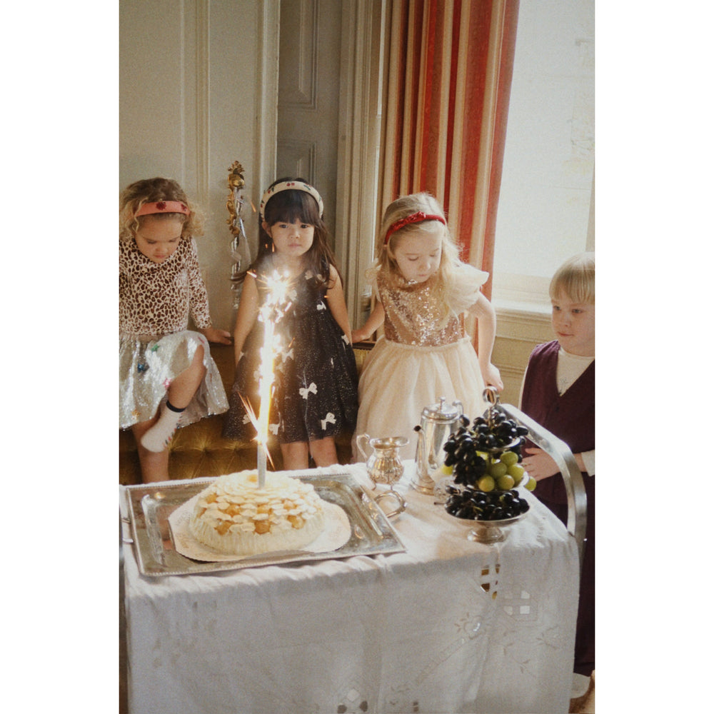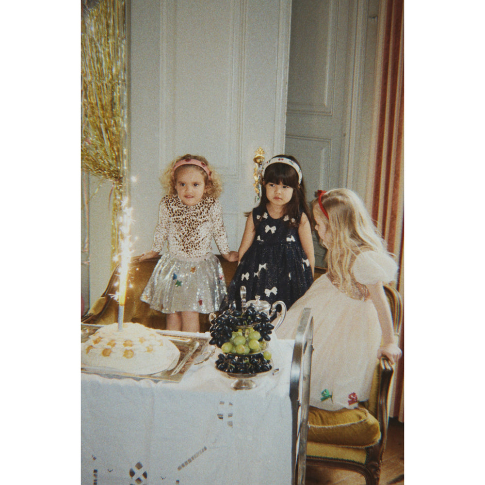 Dress your little star in the magical Konges Sløjd Bowie Night Sky Sequin Yvonne Dress. Perfect for special occasions, this enchanting tulle dress features sparkly sequin bows and a shimmering all-over effect. The soft cotton lining and voluminous skirt promise utmost comfort, while the elegant mother of pearl button at the neck adds a charming touch. Easy to care for and absolutely stunning, it’s a piece that brings both style and comfort to your child’s wardrobe.