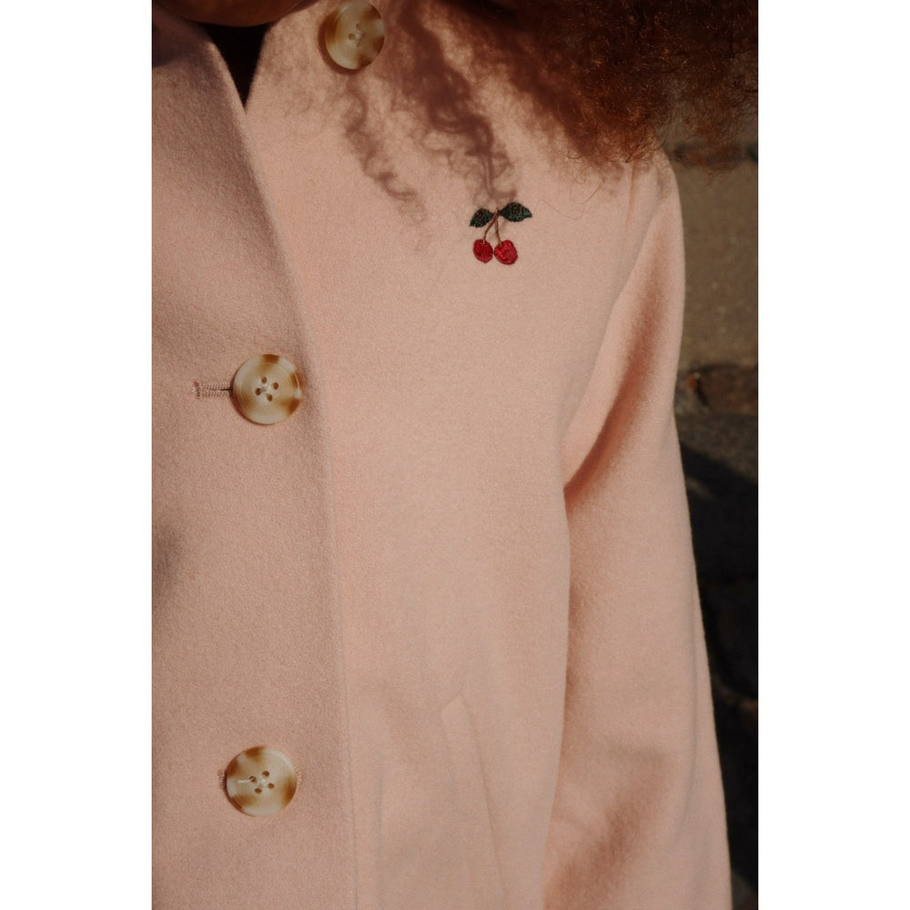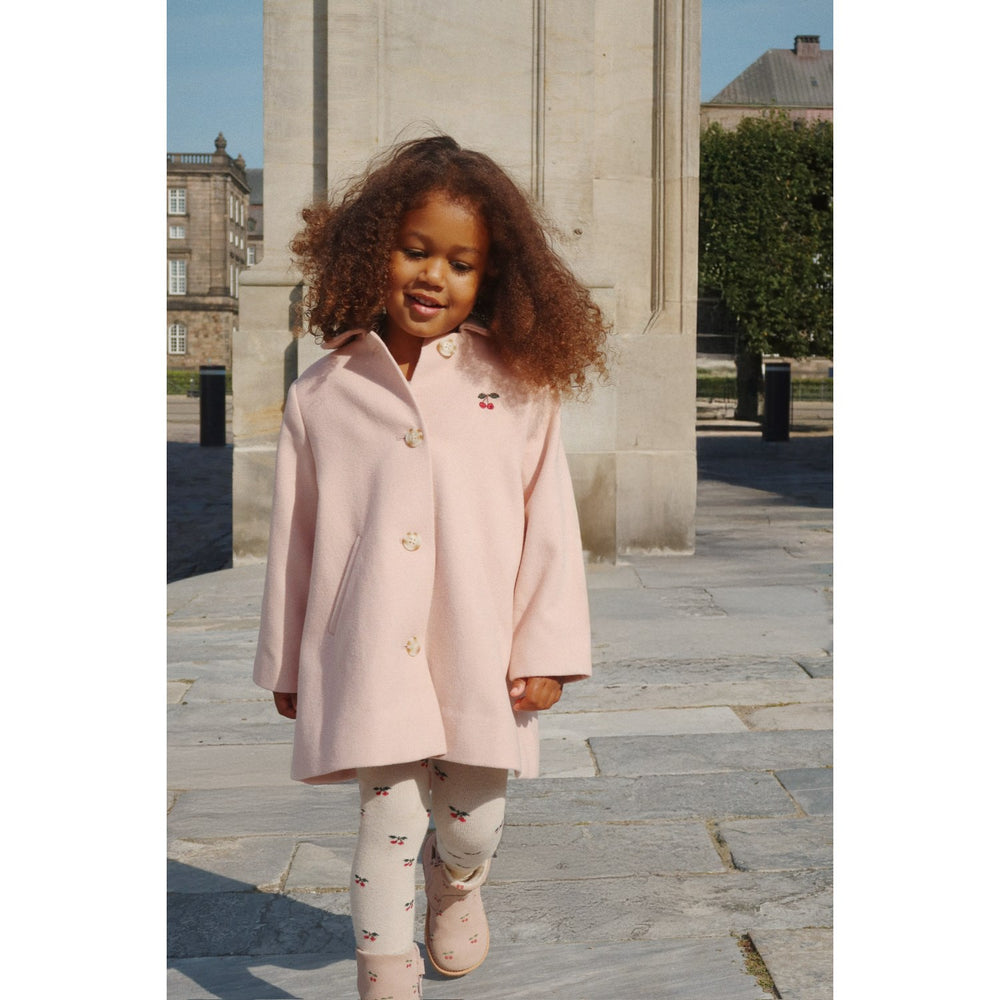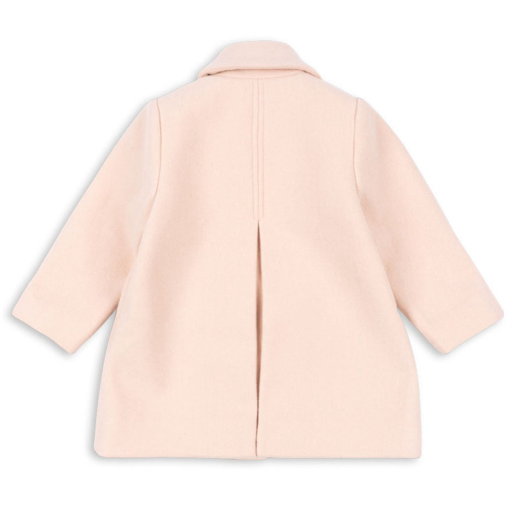 Discover the charming elegance of the Konges Sløjd Peach Whip Novella Coat. This classic coat features a gentle A-shape silhouette and a stylish slit in the back to ensure mobility. Crafted with a neat regular collar, practical welt pockets, and secure horn buttons, it offers both fashion and functionality. The pastel peach hue adds a soft touch to your child's wardrobe, making it a perfect blend of comfort and chic style. Ideal for cooler days, it promises to keep your little one both warm and irresistibly stylish.