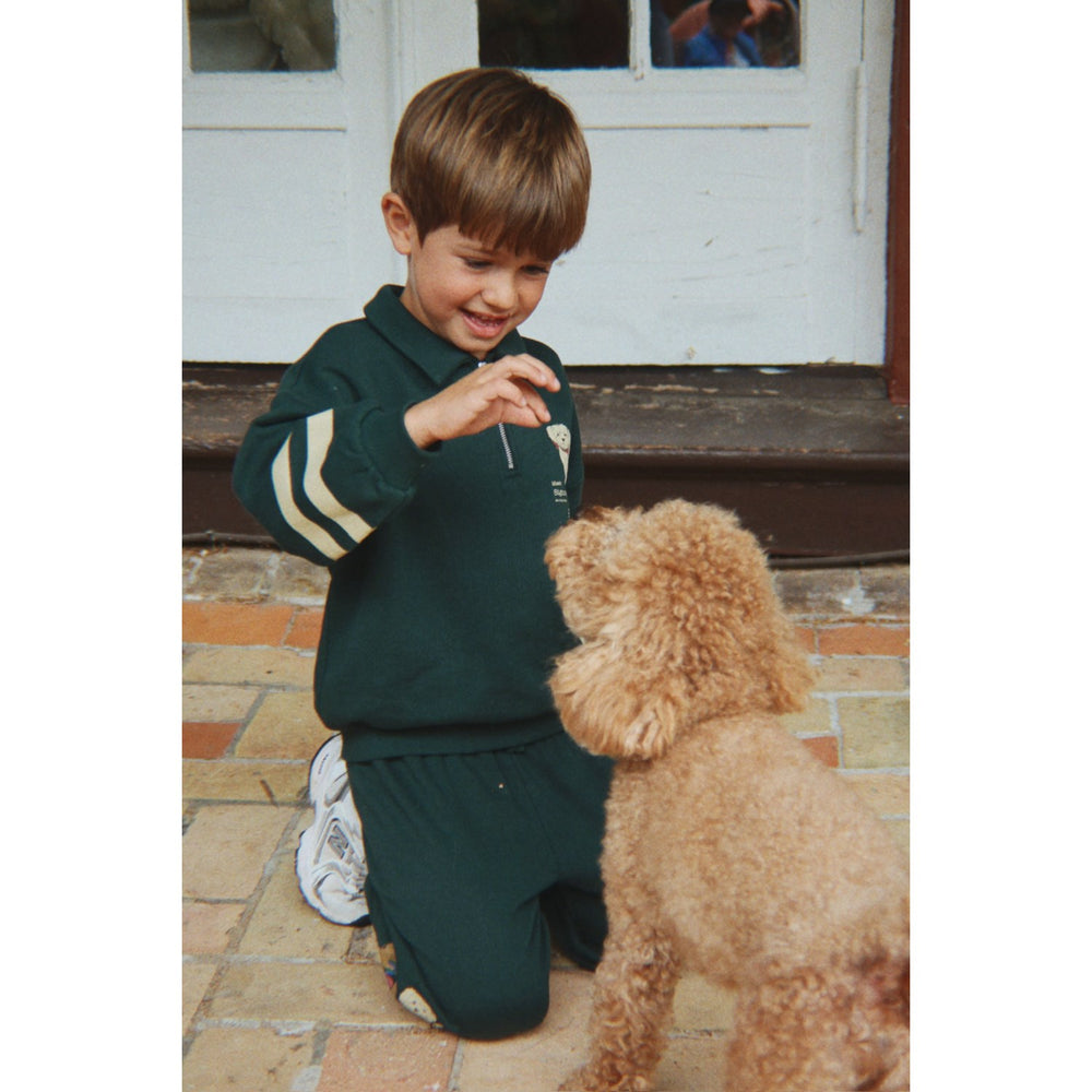 Introducing the Konges Sløjd Pine Grove Doggy Half Zip Polo, the perfect addition to your child's wardrobe. Crafted from 100% OCS-certified cotton, this soft sweatshirt is cozy and gentle on delicate skin. The classic half-zip design features a high collar and easy zipper closure, adorned with chic contrast stripes on the sleeves for a stylish look. Ideal for casual outings or comfy playdates, this sweatshirt ensures comfort and wearability while making care a breeze. Embrace a blend of fashion and functionality with this charming piece! Materials: 100% Organic Cotton
