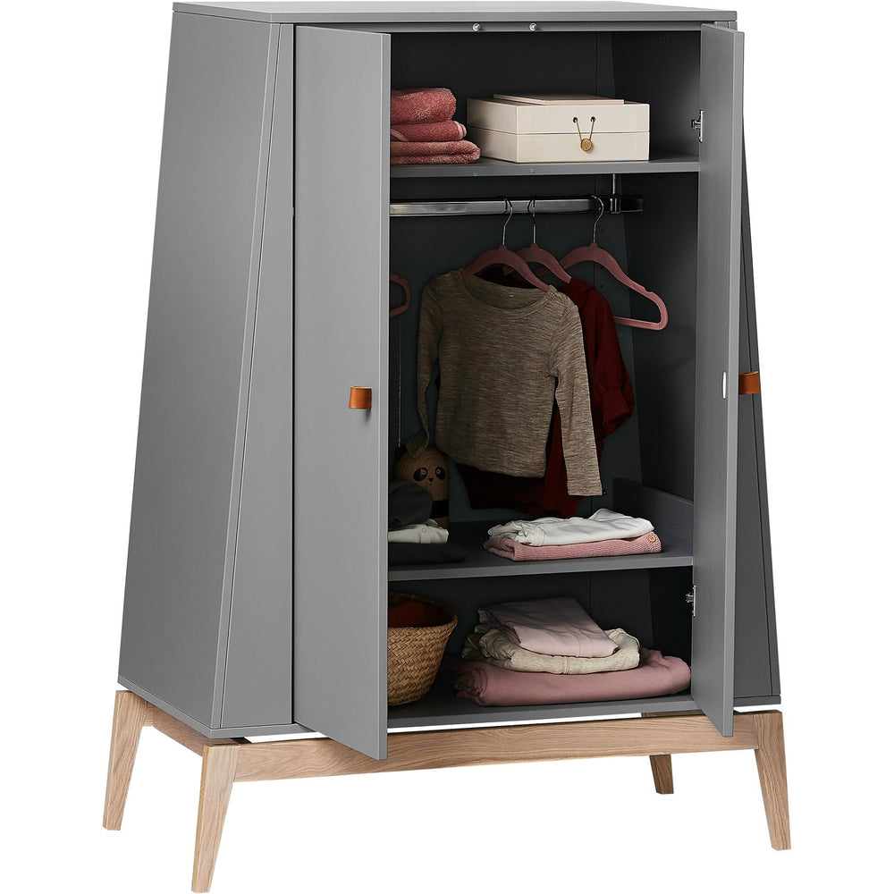 Discover the magic of organization with the Leander Grey Luna™ Wardrobe Small! Crafted meticulously for safety and durability, this compact wardrobe is perfect for your little one's room. Its sleek design seamlessly blends functionality with sublime aesthetics, offering ample storage without sacrificing style. Comfortably accessible and ergonomically designed, it encourages children to learn tidiness early on, making it a delightful addition to any child-centric space. Materials: Bottom: solid oak, chipboard, Upper: MDF, surface lacquered Measurements: 138 x 103 x 52 cm Washing instructions: Wipe with a slightly damp cloth. Excess water is wiped off with a dry cloth Certifications: EN 71-3
