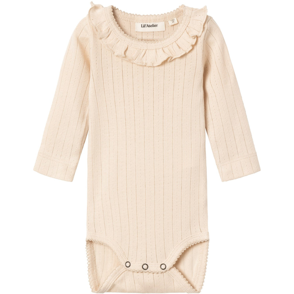 Treat your little one to the Lil'Atelier Sheer Bliss Rachel Nis Slim Body Noos, a bodystocking that is both stylish and comfortable. This item is made from soft materials that ensure all-day comfort, while the cute frills and unique needle drop pattern add a charming touch. With its neutral color and trendy design, this bodysuit is suitable for any occasion. The practical snap button closure makes it easy to put on and take off, and the long sleeves keep your child warm on cooler days. Perfect for both play and rest, this Lil'Atelier bodysuit is not only comfortable but also durable and easy to maintain, making everyday life easier for both child and parent.