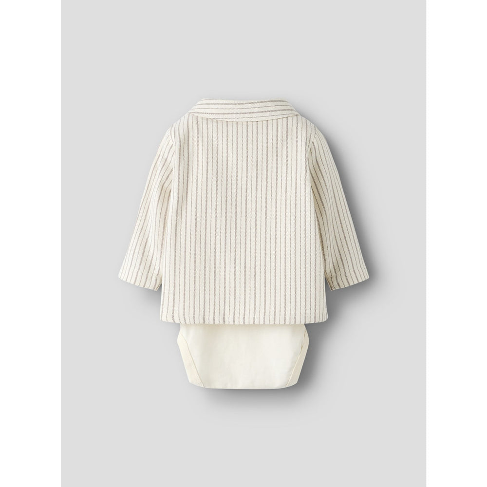 Dress your little one in the charming elegance of the Lil'Atelier Turtledove Sepia Tint Nbmfelixo Ls Body Shirt, perfect for celebrations and important gatherings. This shirt body combines the classic grandad collar with a crisp, woven fabric showcasing a criss-cross pattern that provides a textured yet clean look. Its long sleeves and regular fit ensure your child stays comfortable while looking stylish. Practical features include a convenient button front and press stud fastenings at the crotch. It also sports a chest pocket and a subtle label detail. Always remember to keep this garment away from fire to ensure your child's safety. Fit: Regular Materials: 100% Cotton - Organic Washing instructions: Maximum Washing Temperature 40°C - Normal Process Extra: The main material in this product contains a minimum of 50% organic cotton. Organic cotton is grown without the use of harmful chemicals. Organic cotton farming protects natural resources and biodiversity.