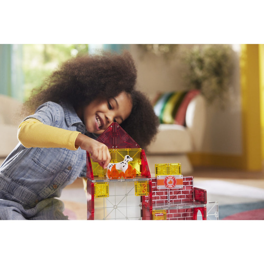 50 magnetic pieces, including a mix-and-match firefighter figure, light and sound tile, and a retractable fire truck ladder.