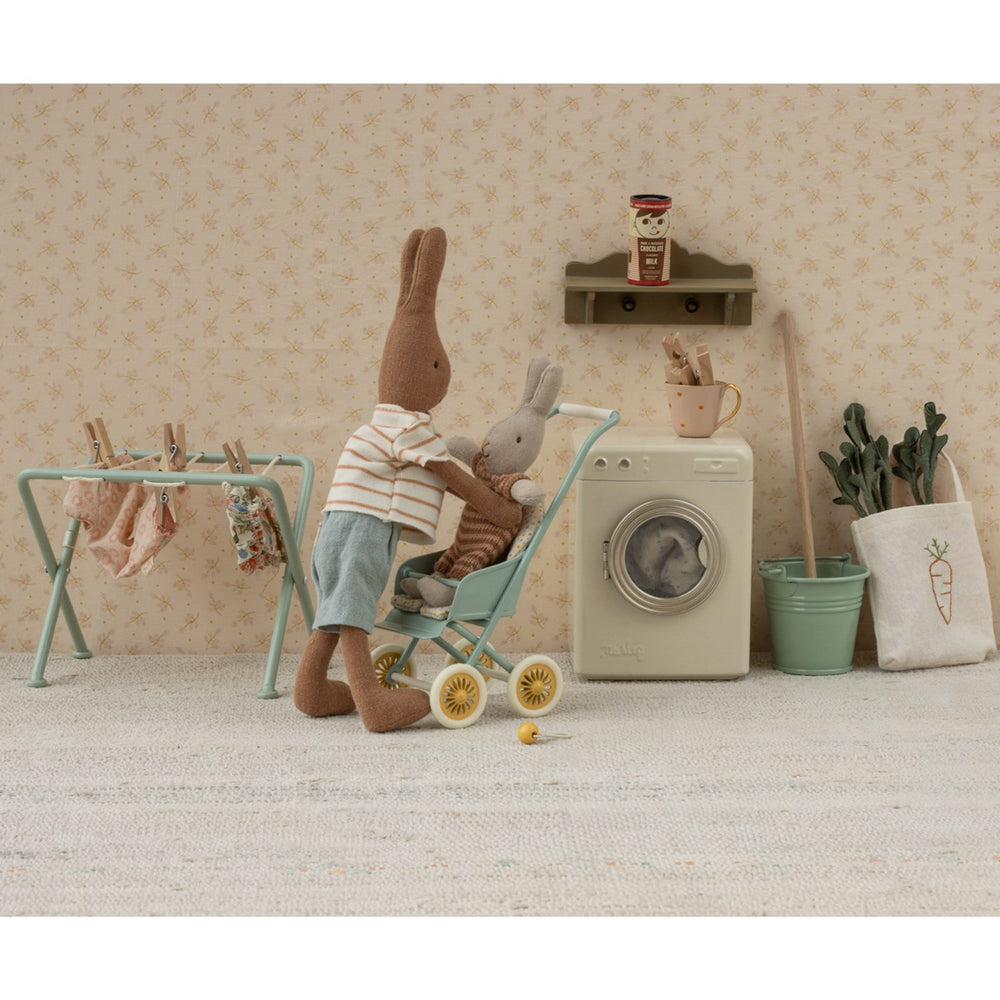 Ignite your child's imagination with the Maileg Stroller, Micro in refreshing mint. This charming doll accessory is designed with safety and ease of use in mind, making it perfect for little hands. Appropriate for ages 3 and up, it's not only portable but also easily stored away. This stroller encourages interactive play, boosting your child's developmental skills in a fun, engaging way.