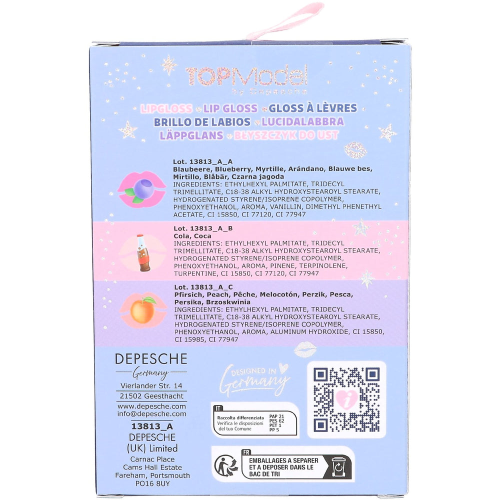 Introducing the delightful TOPModel Beauty And Me Lip Gloss Set, perfect for little ones who love a bit of sparkle. This set features three 8ml tubes of lip gloss in pink and peach shades, each with its own unique scent—blueberry, cola, and peach. Dermatologically tested and gluten-free, these lip glosses ensure safe and enjoyable use. Ideal for creative play and daily beauty routines, the set's compact size makes it easy to store and perfect for on-the-go touch-ups. A wonderful gift that combines fun and safety in one adorable package!
