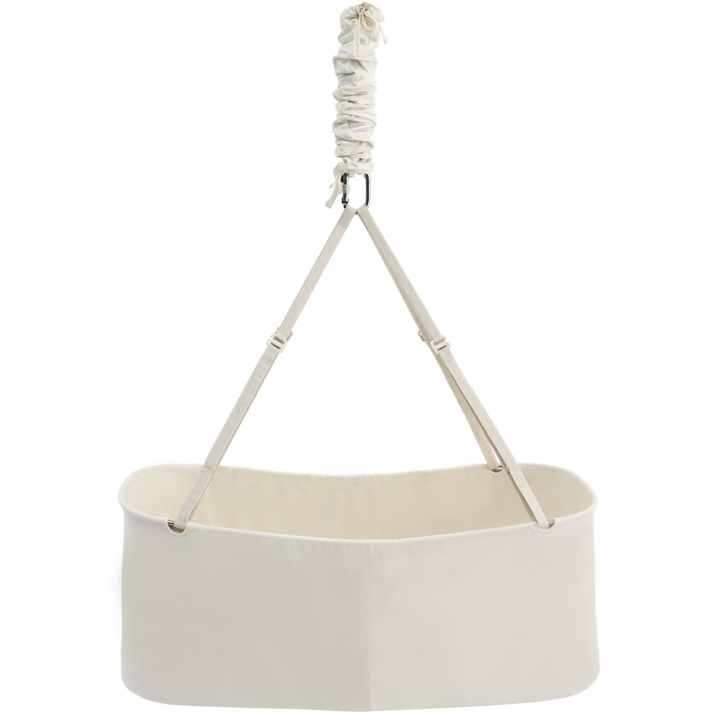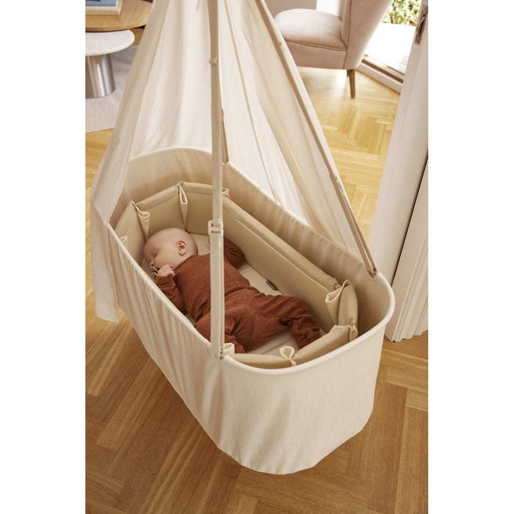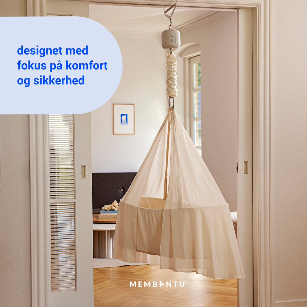 Discover the blissful comfort of the MEMBANTU Nature Baby Cradle, specifically designed for newborns and babies up to 15 kg. Crafted from luxurious organic cotton, this exquisite hanging cradle features a gentle spring mechanism that soothes your baby with a calming up-and-down motion. Safety is paramount, ensured by built-in loops for a baby harness and a firm foam mattress surrounded by a soft organic cotton cover. With an 85 cm lying length, it provides ample space for your baby's comfort. The cradle's fabric is not only gorgeous but also conveniently removable and machine-washable, making maintenance a breeze. Ideal for nurturing your baby's sleep, the stylish design seamlessly integrates into any nursery, providing both functionality and aesthetic appeal. Age: 0-10 months Materials: Fabric: Organic cotton. Mattress: Foam with Organic cotton cover. Straps: Nylon straps with metal buckle. Other: Steel frame, Spring with organic cotton cover, carabiner. Measurements: 85x40x32,5 cm Washing instructions: The fabric is easily removable for machine washing at 30 degrees Celsius