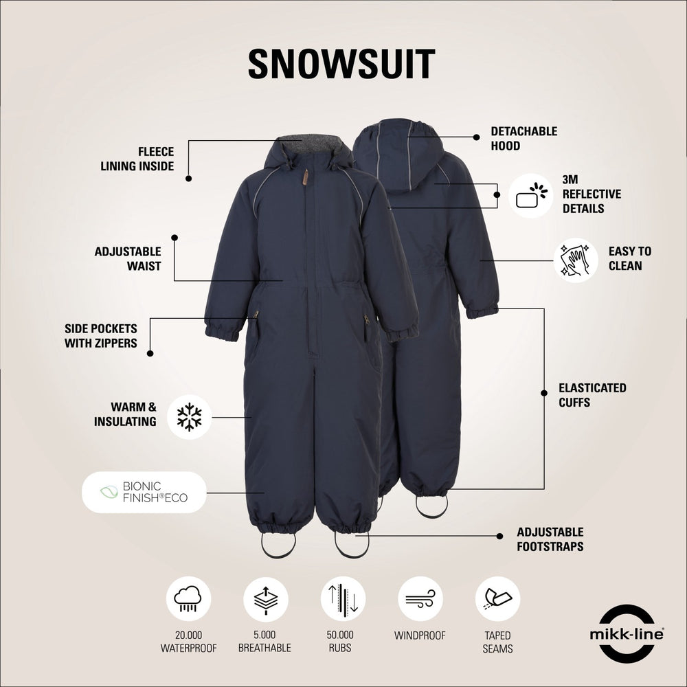 Prepare your little one for fun-filled snow days with the Mikk-Line Blue Nights Nylon Suit Solid. This durable, high-quality snowsuit, designed with children in mind, guarantees warmth, dryness, and comfort during all kinds of wintry conditions. The suit's resilient nylon material is enhanced with a BIONIC-FINISH® ECO fluorine-free coating, promoting environmentally friendly wear without sacrificing performance.