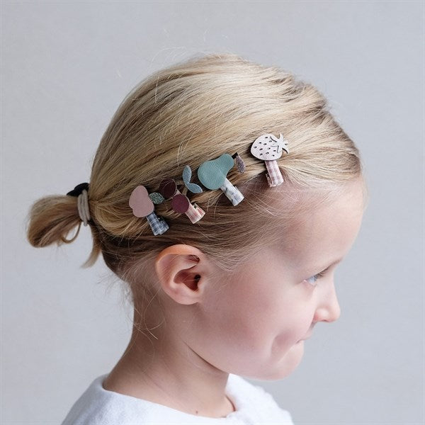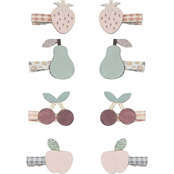 4 pairs of mini hair clips with strawberries, cherries, apples and pears.