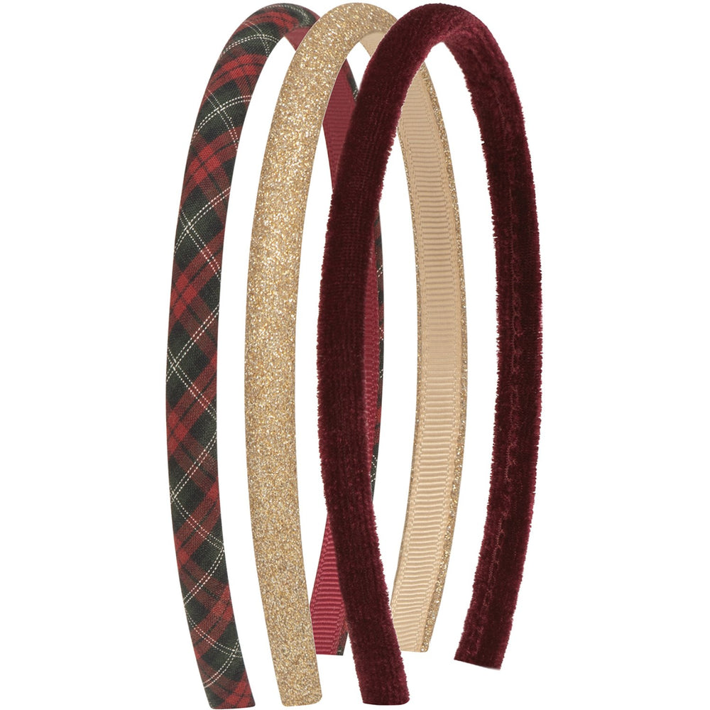 Introducing the whimsically charming Mimi & Lula Red Tartan Pony Pals headbands! Each of the three bands is skillfully upholstered in captivating materials - tartan netting, shimmering gold glitter, and rich burgundy fabric. These adorable accessories are perfect for enlivening any outfit, combining comfort with durability for everyday wear. Ideal for festive occasions or adding a sparkle to everyday play, these headbands are sure to delight your little one while keeping their hair tidy in style.