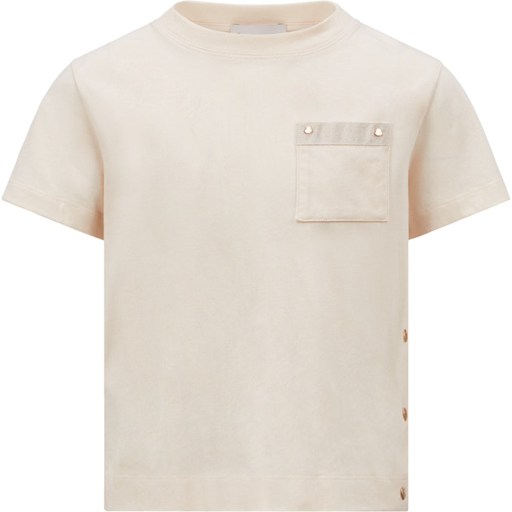 Dress your little one in the Moncler Cream T-Shirt for a touch of everyday luxury. This cotton jersey T-shirt is ultra-soft and ensures all-day comfort for your child. It features a charming chest pocket and glittering gold-tone side buttons for a touch of elegance. Perfect for play dates or casual outings, this t-shirt guarantees both style and substance to fashionable young girls.