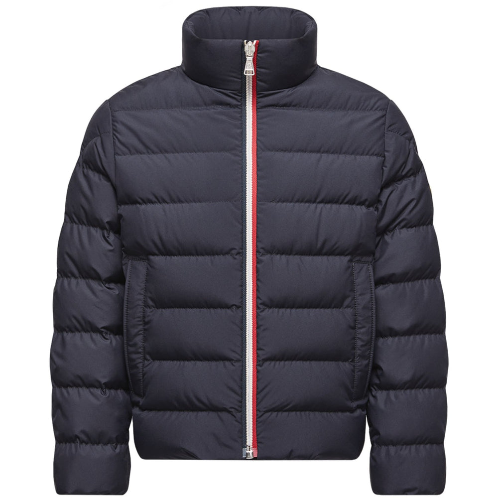 Keep your little adventurer cozy and stylish with the Moncler Navy Serapio Jacket. Made with eco-friendly recycled polyester and snug down filling, this piece ensures warmth during chilly play days. The playful tricolor zipper trim adds a dash of fun, making it a perfect go-to for any outdoor escapade! Materials: Outer: 100% Polyester, Lining: 100% Polyester - Details Padding: 100% Polyester, Down 90% + Feather 10% Washing instructions: Remember to follow washing and user instructions Crafted from recycled polyester Polyester lining Down-filled Stand collar Zipper closure Pockets with snap button closure Elastic cuffs Tricolor trim