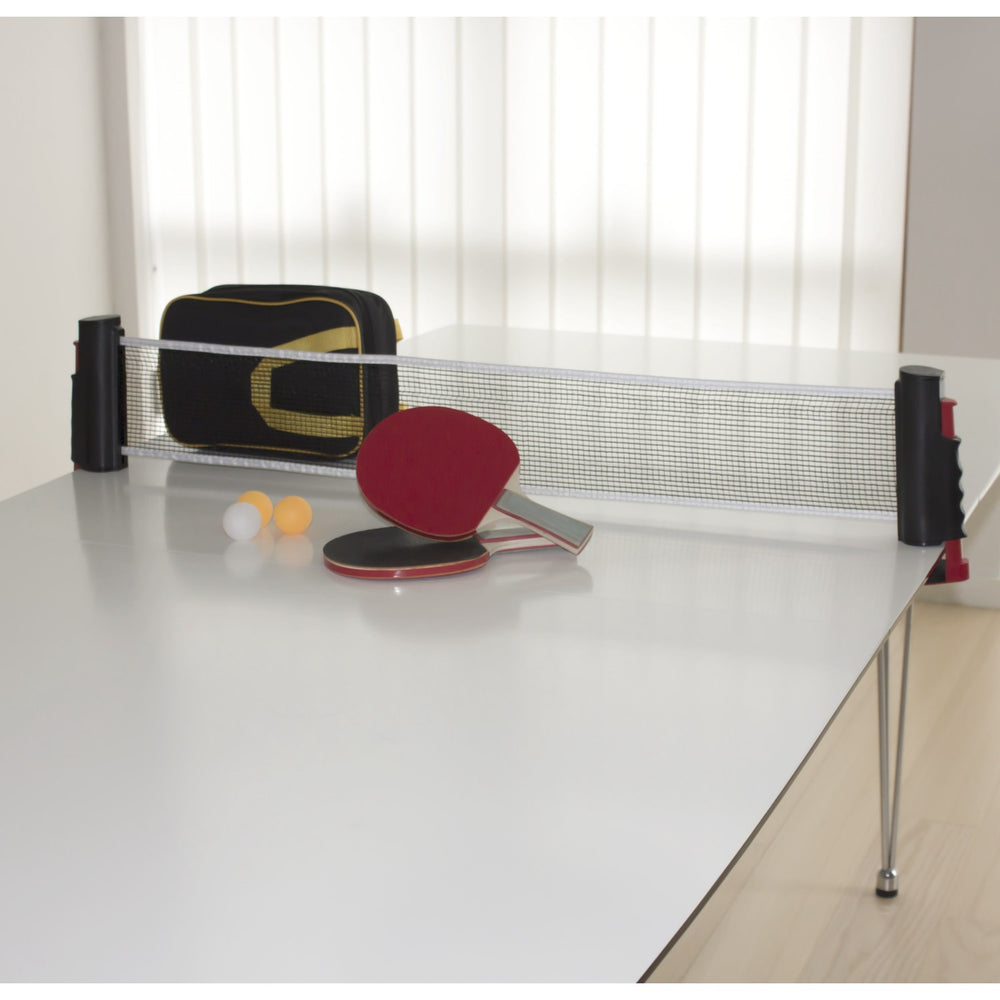 - Extra: Net mounted on spool pull-out in two strong plastic posts Adjustable up to 160 cm Suitable for sheet thicknesses up to 5 cm The net is always tight - regardless of the size of the table Included 2 rackets in regular size and 3 balls Incl. bag for storage and transport
