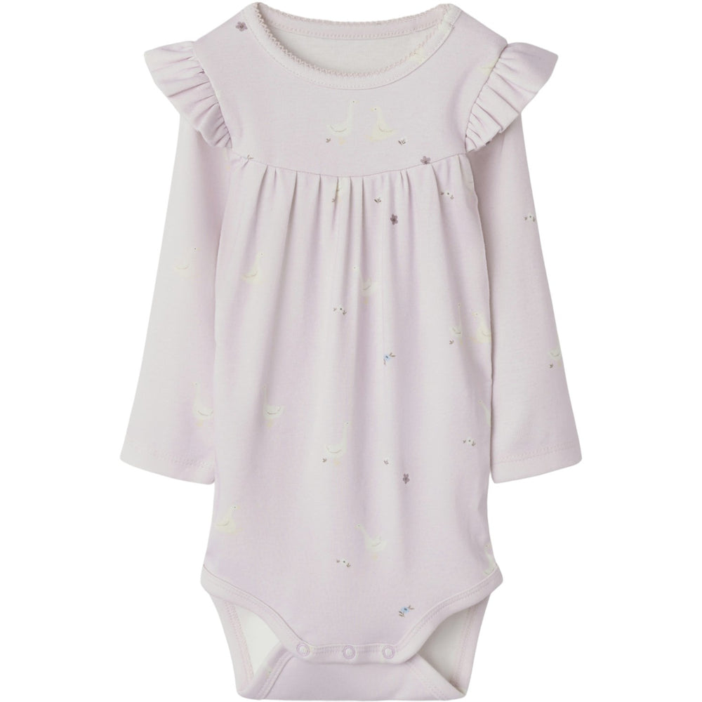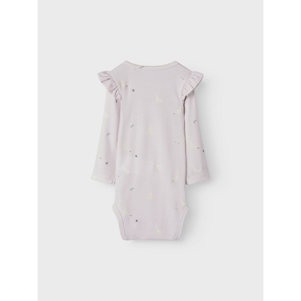 Introducing the Name It Light Lilac Disse Body, a delightful addition to your child's clothing collection. Made from jersey, this bodysuit is not only lightweight and stretchy but also ultra-soft on both the outside and inside, ensuring maximum comfort and mobility for your little one. It features a charming round neck and long sleeves, perfect for all-season wear. The practical press stud fastenings at the shoulder and bottom make dressing hassle-free, while adorable frills add a touch of whimsy. Adorned with a cheery print that spans the entire surface, this bodysuit combines fun and functionality. As always, remember to keep this garment away from fire to ensure your child's safety. Ideal for both playtime and relaxation, it promises comfort and style in one adorable package.