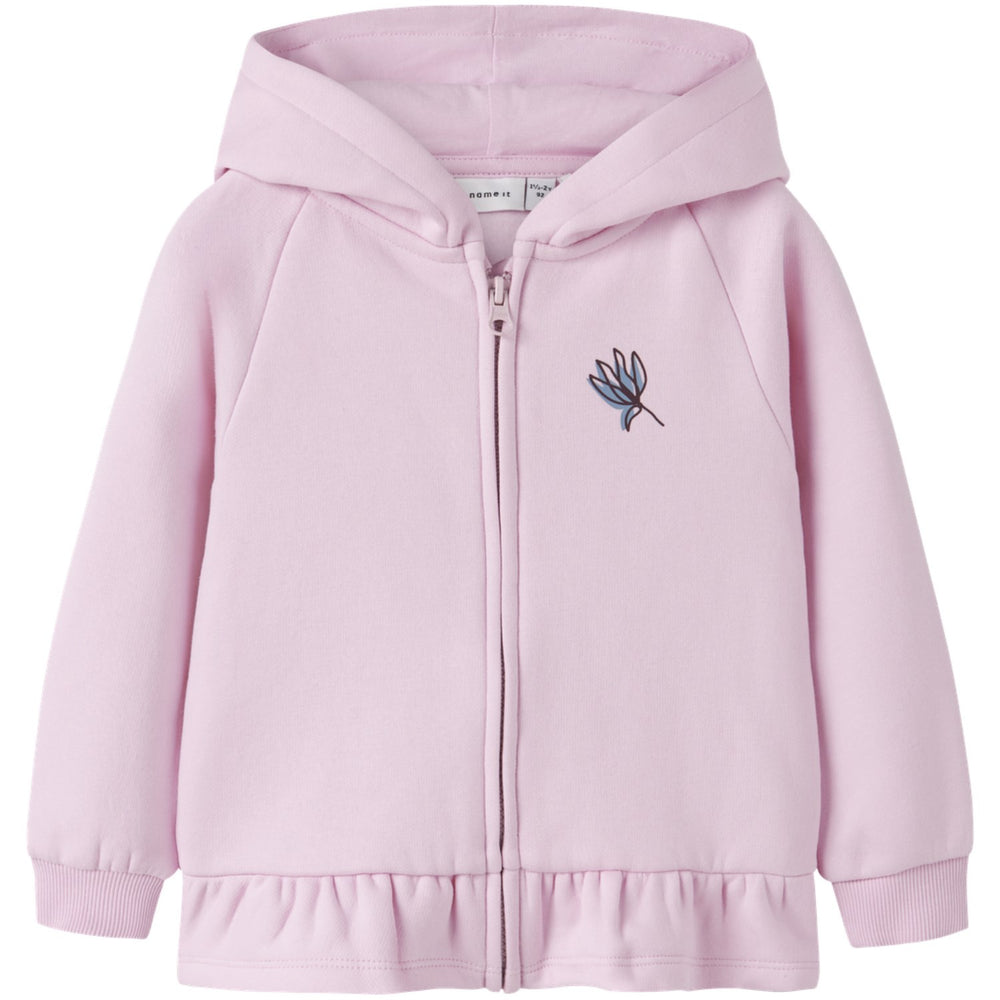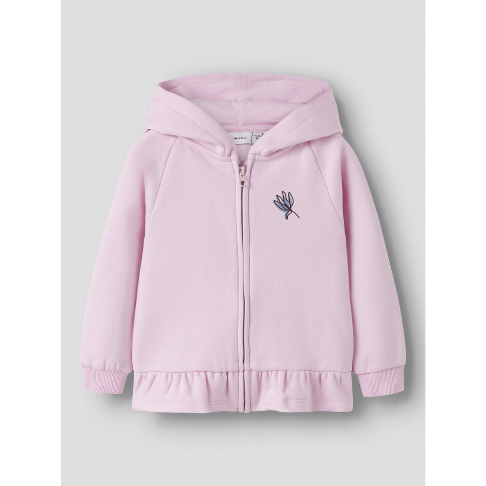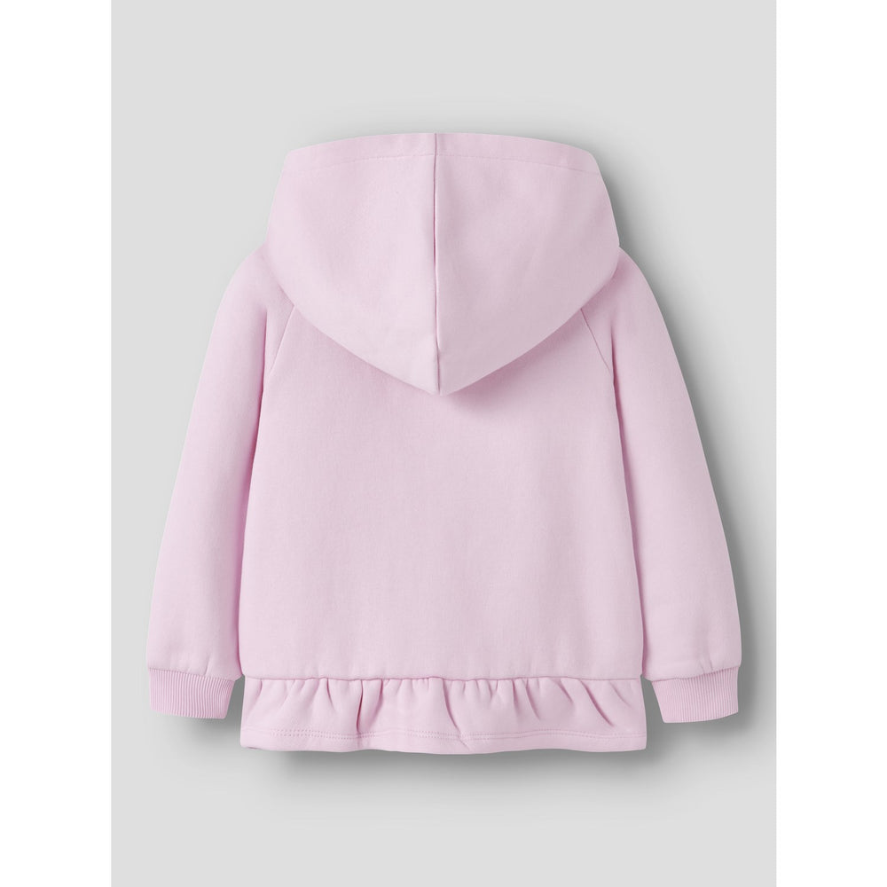 Add a touch of coziness to your child's everyday ensemble with our Name It Nosegay Nmfopera Ls Swe Card Bru Wh Bf. Crafted from a plush cotton-polyester blend, this cardigan combines durability with soft comfort, thanks to its brushed sweat fabric with a gentle interior. Featuring a convenient zip fastening, long sleeves, and a hood for added warmth, this garment is accentuated with a charming peplum detail and enhanced with a soft pigment print. Perfect for layering, the regular fit ensures easy movement, making it an ideal choice for playdates or casual outings. Easy to care for, this cardigan merges style, comfort, and practicality in one delightful piece.