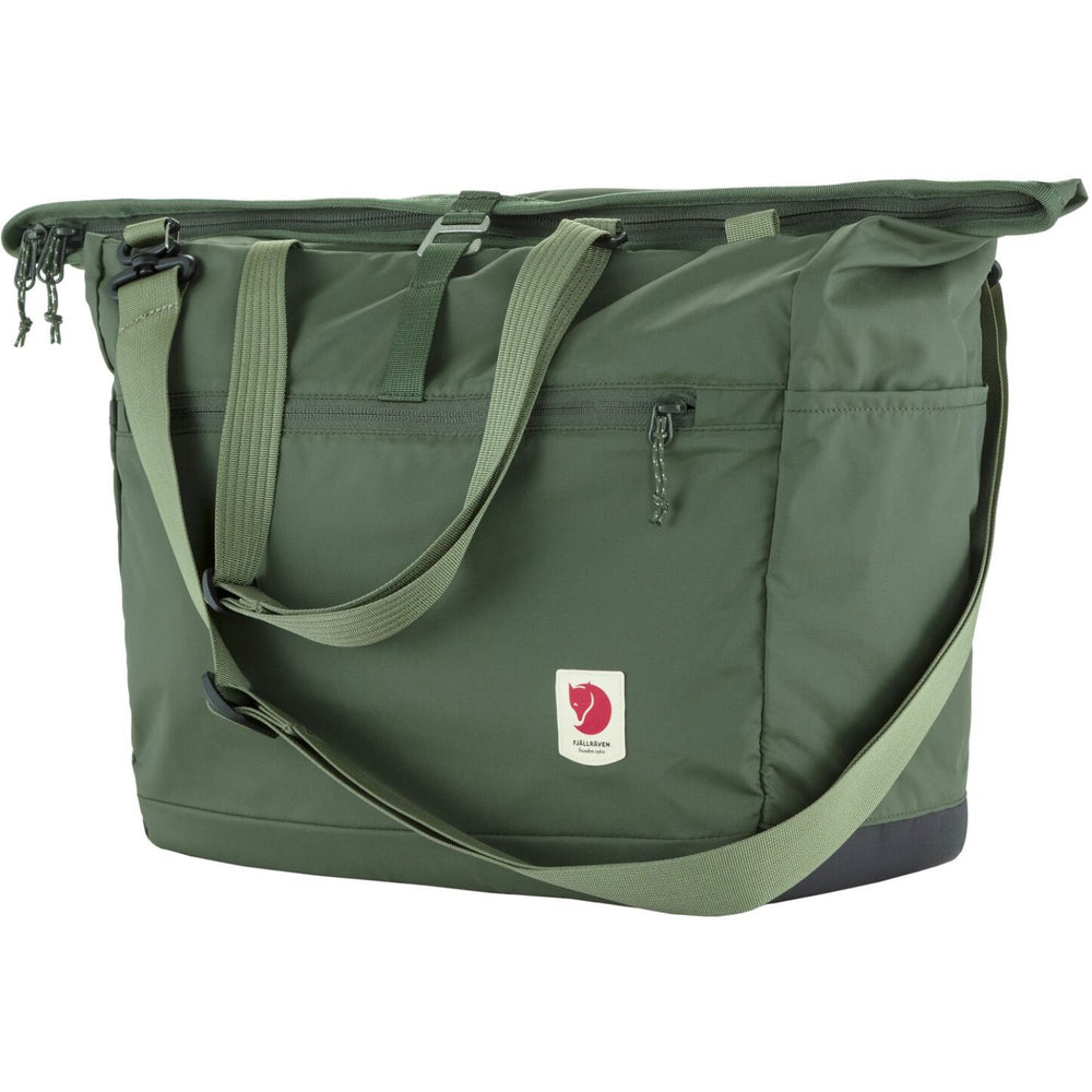 With the Fjällräven Mountain Green High Coast Tote 30, you get a spacious and lightweight shoulder bag, ideal for both everyday use and excursions. This 30-liter tote is designed for versatility and comfort, with adjustable handles and a detachable shoulder strap that provides multiple carrying options. The bag's large main compartment has a sturdy zipper closure and a metal hook that allows extra packing. Made from recycled polyamide and equipped with a water-repellent coating, it's both durable and practical for keeping your belongings safe and dry. The combination of back panel and bottom padding as well as several pockets ensure optimal organization and comfort.