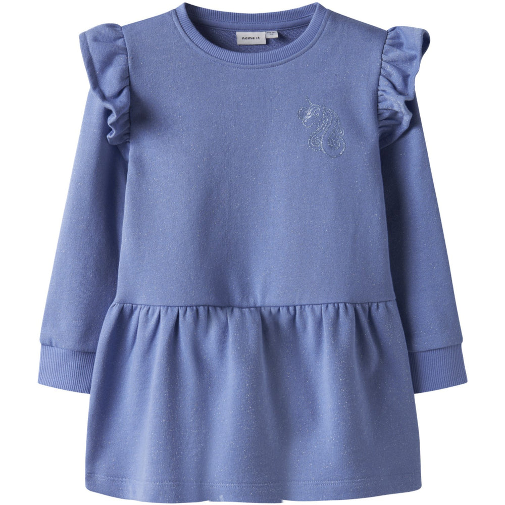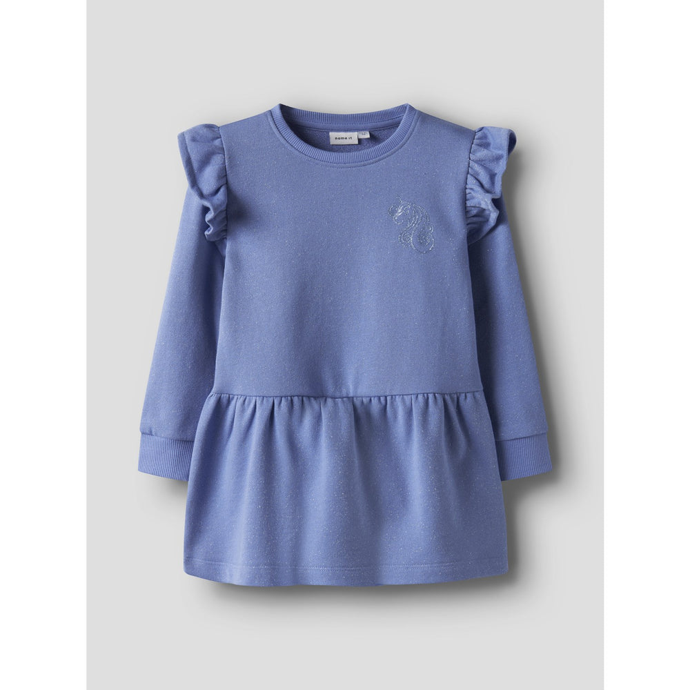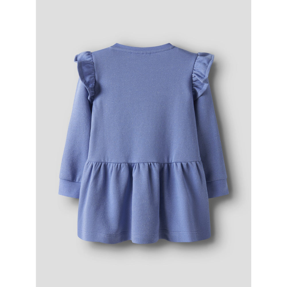 Introduce your little one to effortless style with the Name It Persian Jewel Nmftilde Nreg Swe Dress Unb Pb. This charming dress is crafted from unbrushed sweat fabric, featuring a smooth outer surface and soft loops inside, ensuring comfort all day. Boasting a playful round neck and long sleeves, it features delightful ruffles and a cute cutline at the waist. The regular fit allows for easy movement, making it perfect for playdates to parties. Easy to care for, it's the ideal addition to any child's wardrobe for year-round fashion.