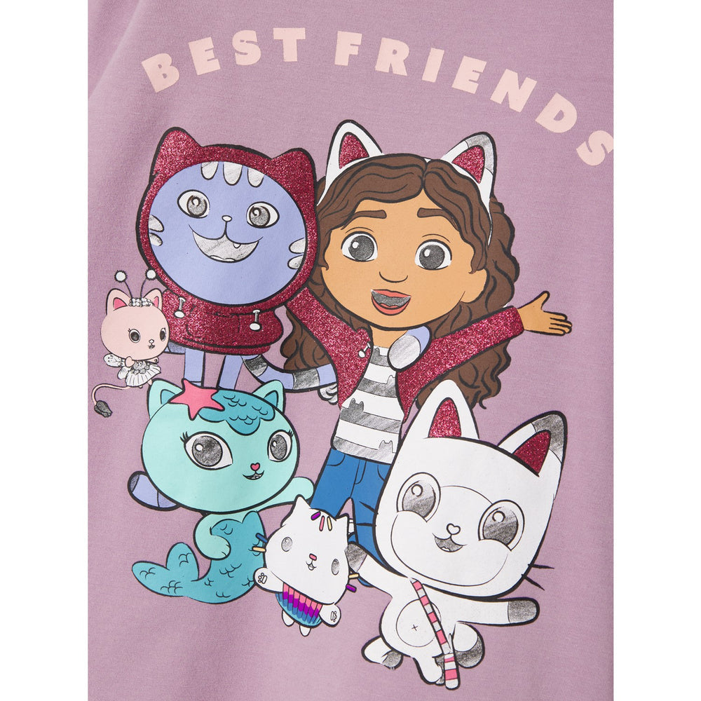 This charming nightgown features puff sleeves and sparkling glitter details that add a touch of magic to bedtime routines. Adorned with a soft rubber print depiction of Gabby's Dollhouse, it brings the vibrant, cheerful essence of the popular Netflix series right into your child's bedroom. The pleasing lavender mist color paired with the playful pattern makes this piece a favorite amongst little fans.